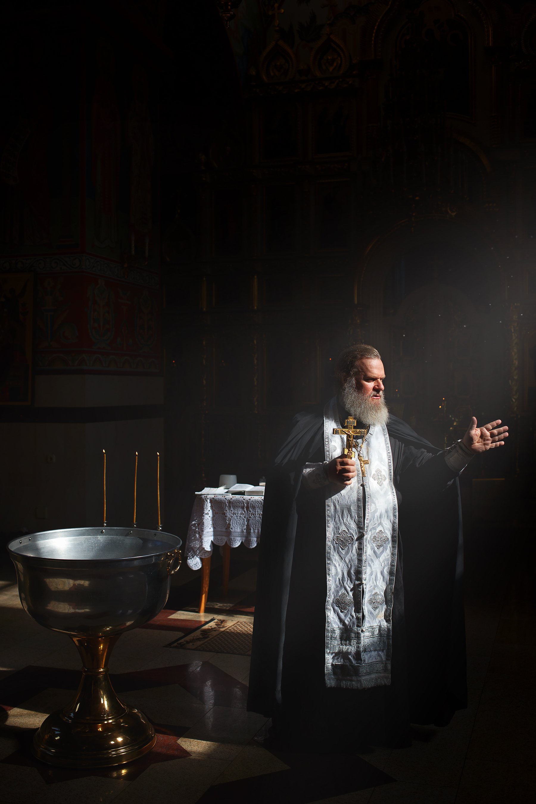 Батюшка, Купель, Свет, Свечи, Собор, Церковь, Инна Сухова