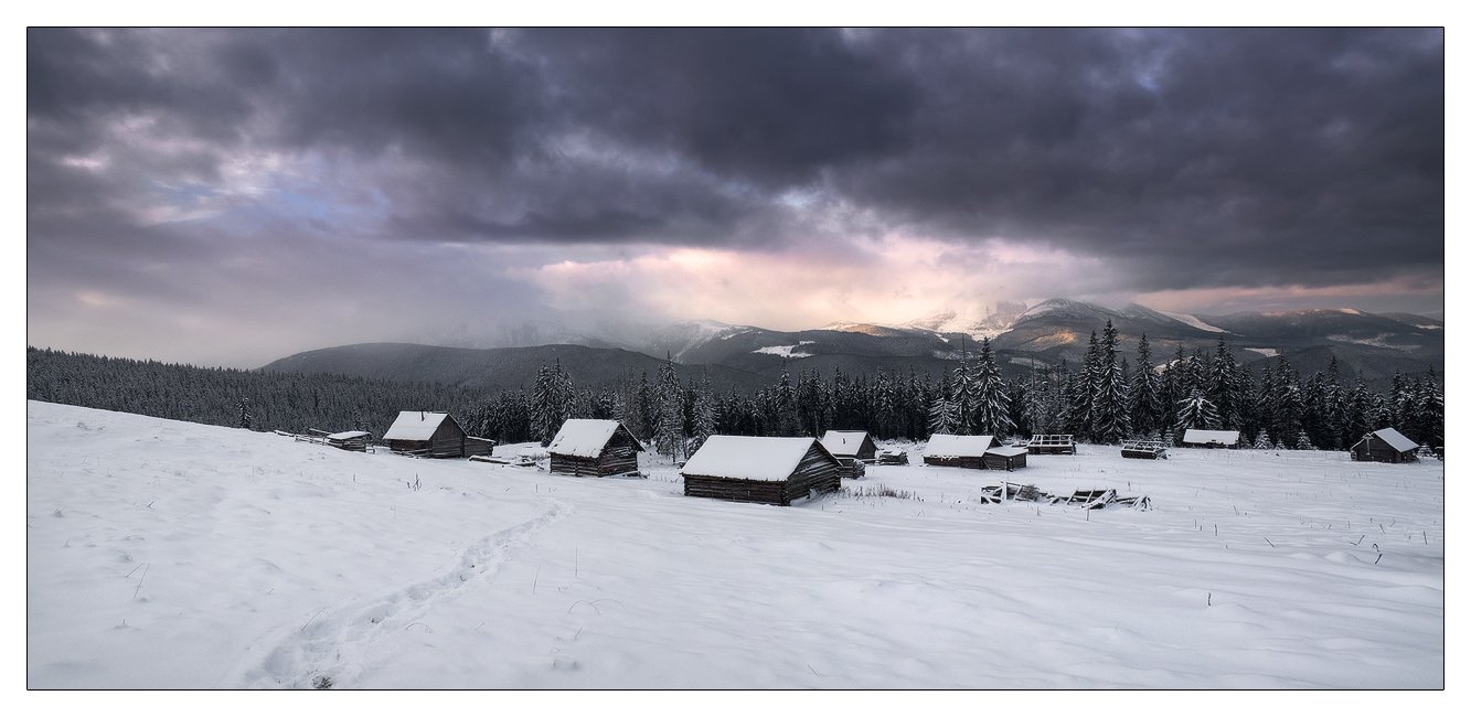 Украина, Карпаты, снято с г. Кукул(укр) Кукуль(рус.). на зп г.Говерла (почти не видно в облаках) и г. Петрос (тоже в облаках но подсвечена немного солнцем)