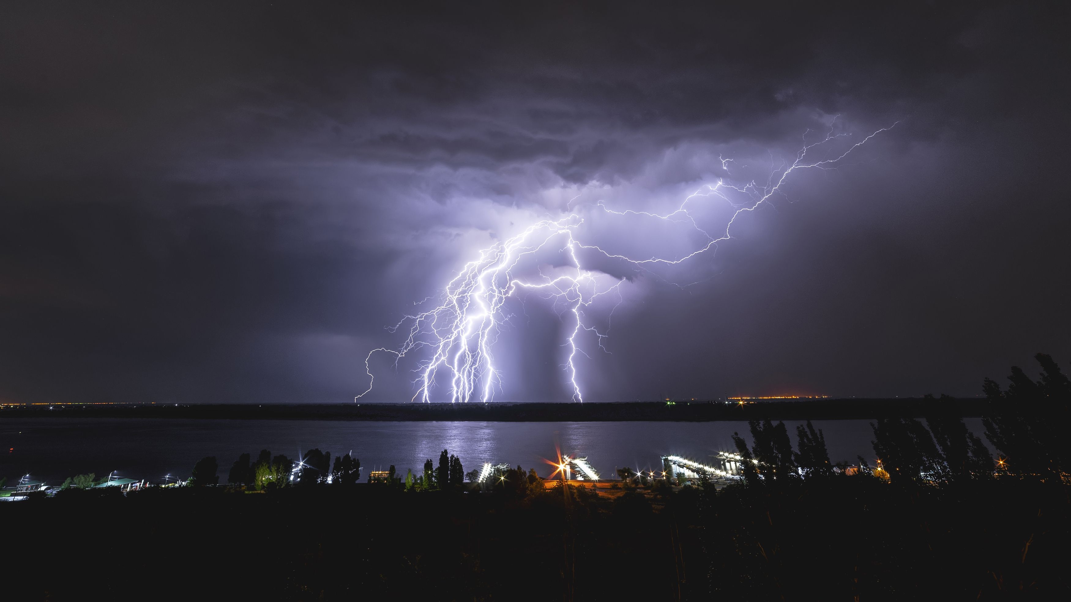 молнии, ночь, широкий угол, река, волга, электричество, разряд, вода, озеро, причал, огни, пирс, гроза, удар, стихия, прогноз, погода, ливень, дождь, Сытилин Павел
