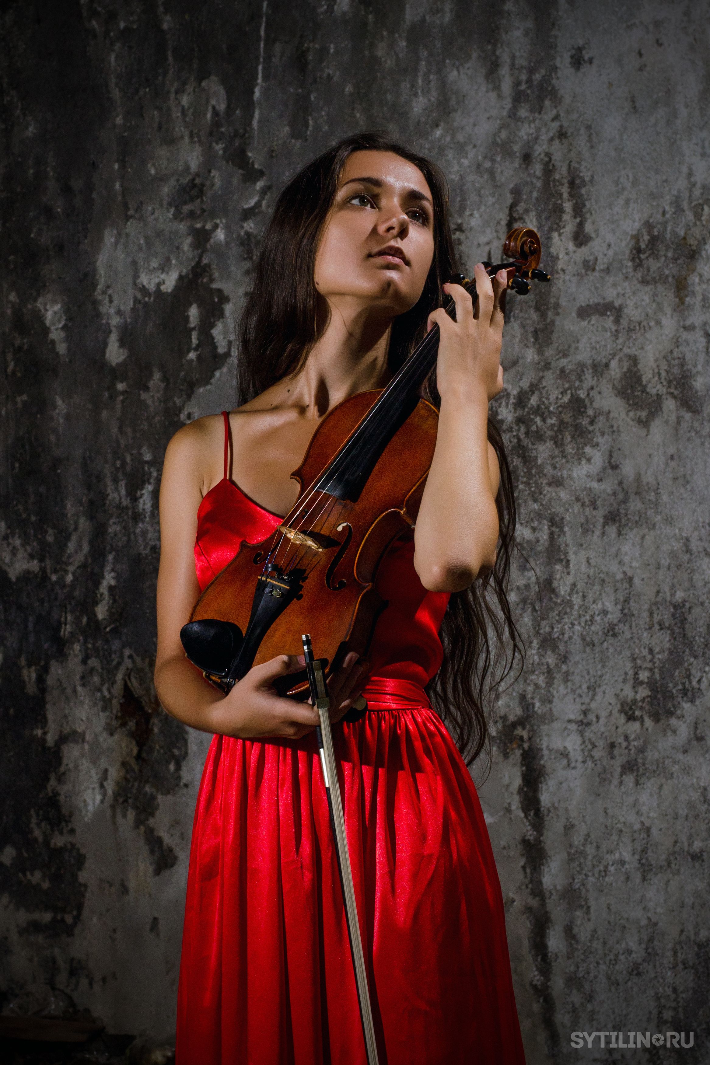 скрипка, девушка, держать, в руках, платье, красный, молодой, стройный, женщина, серый, стена, мрачный, яркий, смычок, играть, музыка, Сытилин Павел