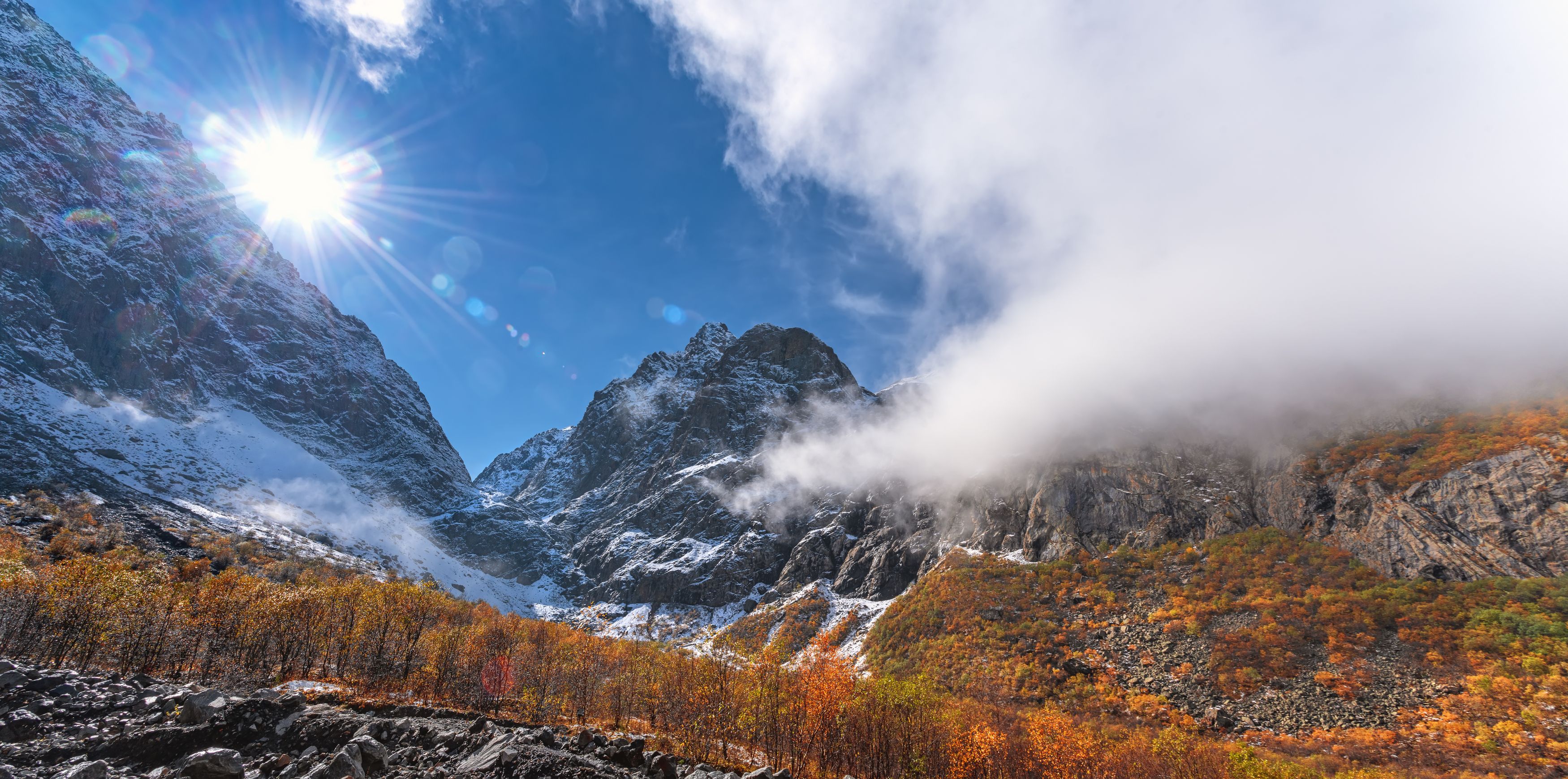 Мидаграбинское ущелье, Кавказ, Северная Осетия, Россия, туризм, путешествие, горы, облако, солнце, солнечный, треккинг, лес, осень, пейзаж, экскурсия, небо, яркий, алания, снег, снежный, вершина, скалы,, Сытилин Павел