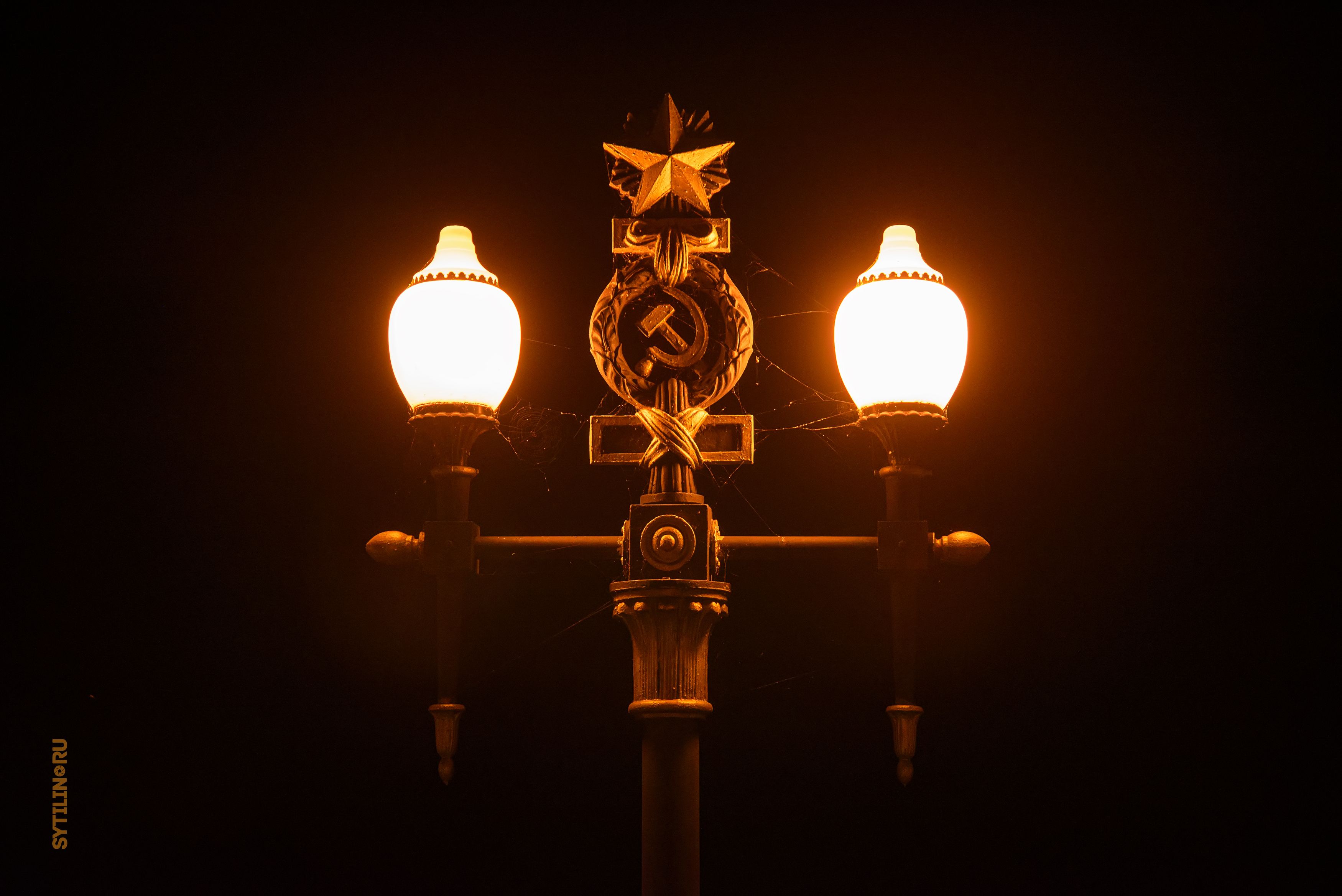 Сталинский,фонарь,чугунный,социализм,великие стройки,волго-дон,серп и молот,звезда,волгодон,ночь,Волго-Донской судоходный канал имени В.И. Ленина.Седьмая шлюзовая камера,шлюз,золотой,черный,темный,канал,украшение,гореть,лампа,плафон,ночной,освещение,яркий, Сытилин Павел