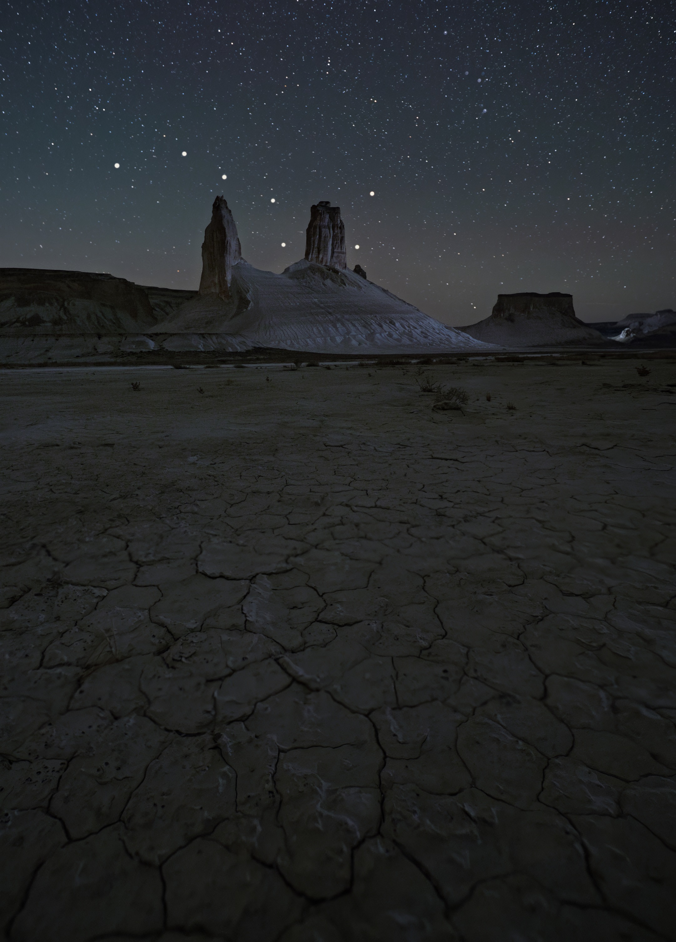 Под бездонным звёздным небом пустыня раскрывает свою суровую красоту. Скальные утёсы, напоминающие клыки древнего зверя, возвышаются над растрескавшейся почвой, словно охраняя тайны земли. Фотография передаёт ощущение одиночества и величия природы, где время замедляется, а человек — лишь наблюдатель. Это не просто пейзаж — это символ выносливости, вечности и тишины, пронизанной светом далёких звёзд.