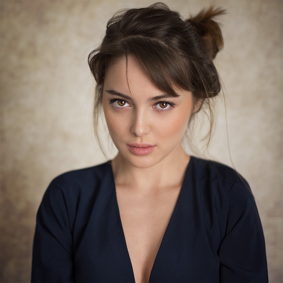 На снимке — молодая женщина в строгом темно-синем наряде, с волосами, собранными в небрежный пучок. Её взгляд прямой и спокойный, выражение лица нейтральное, что придаёт образу глубину и внутреннюю силу. Фотография выполнена в стиле арт-портрета с акцентом на естественность и минимализм. Светлый текстурированный фон усиливает фокус на лице модели, создавая атмосферу сдержанной элегантности. Работа Евгения Сибиряева демонстрирует мастерство в передаче человеческого образа без излишеств.