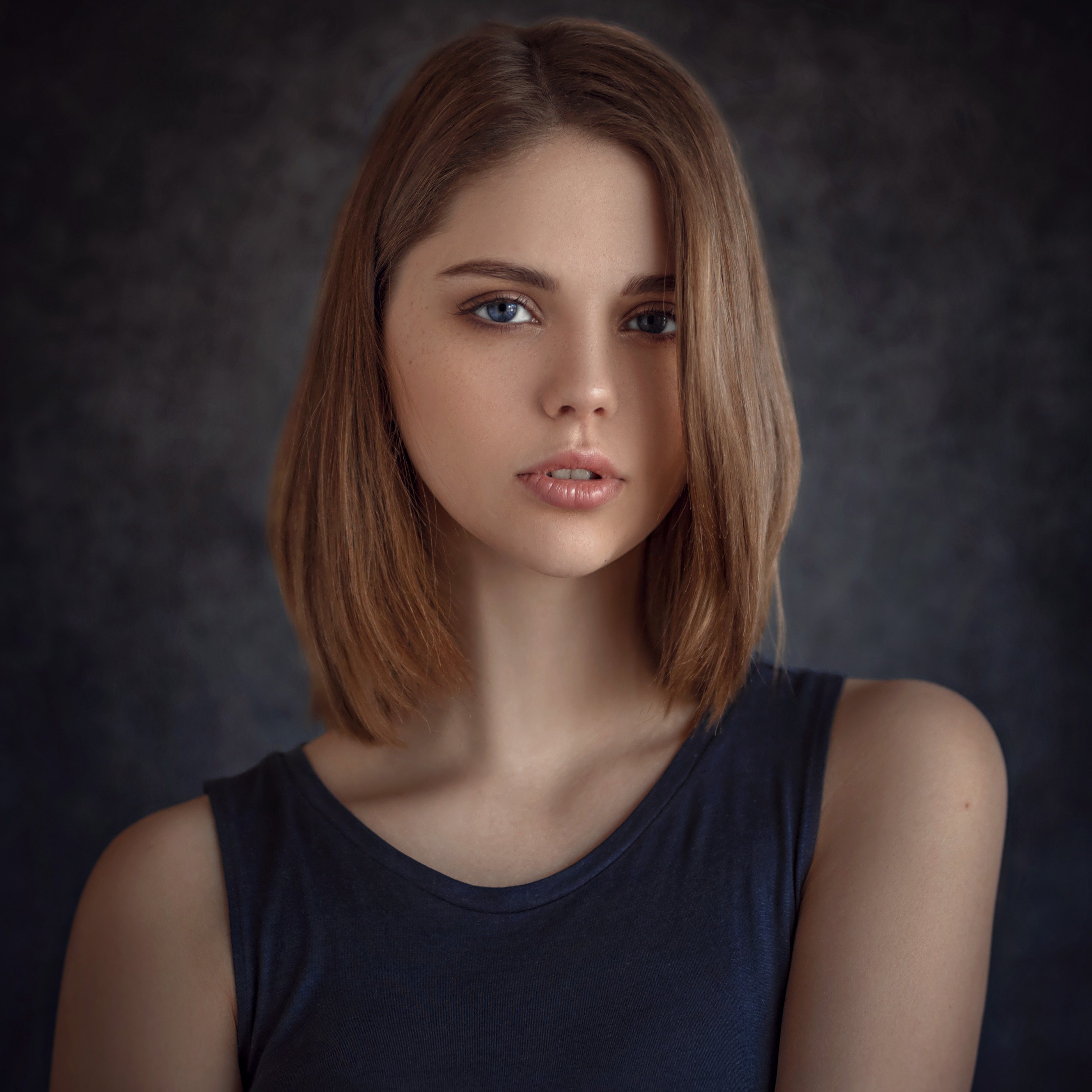 В кадре — мгновение, застывшее в светлых волосах и пронзительном взгляде. Фотограф Евгений Сибиряев запечатлел не просто внешность, а внутреннее состояние — спокойствие, уверенность, незащищённость. Тёмный фон, мягкий свет, лаконичный наряд — всё подчёркивает естественную красоту модели. Это не просто портрет, а художественное произведение, где каждая деталь — часть целого. Анастасия — образ современной женственности, сдержанной и сильной.