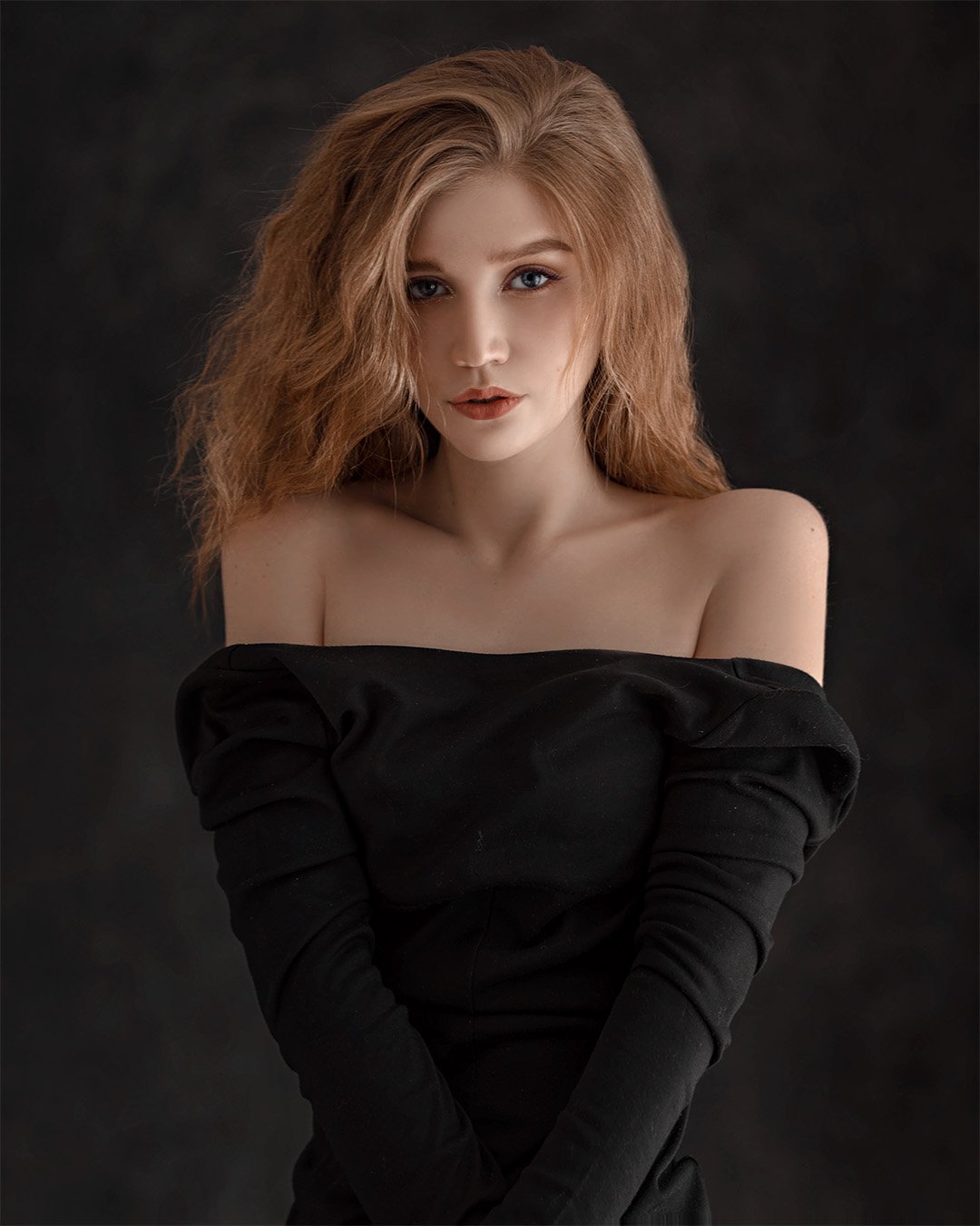 Фотограф Евгений Сибиряев запечатлел Марию в момент тишины и внутренней силы. Тёмный фон усиливает контраст с её светлыми волосами и выразительными глазами, а чёрное платье с пышными рукавами придаёт образу театральность и изысканность. Каждый элемент композиции — от освещения до позы — служит выразительности образа, превращая портрет в произведение искусства. Это не просто снимок — это история, застывшая в кадре.