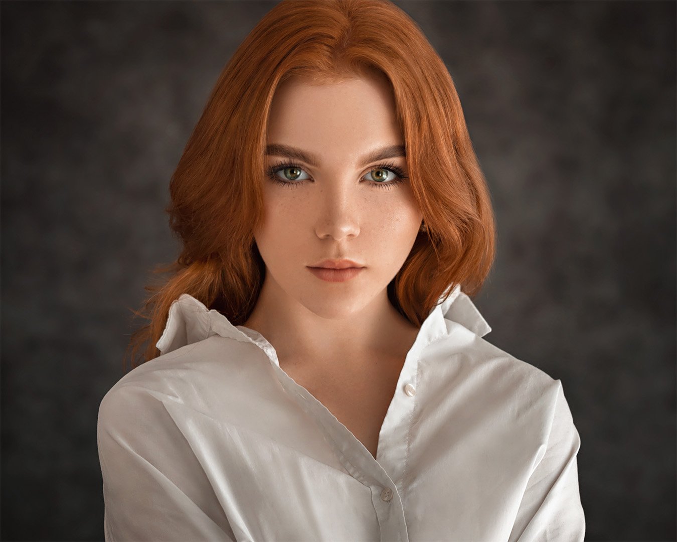 Снимок передаёт спокойную силу и внутреннюю уверенность модели. Рыжие волосы мягко ложатся на плечи, а белая рубашка создаёт контраст с тёмным фоном. Глаза смотрят прямо в объектив — без эмоций, но с глубиной. Свет акцентирует черты лица, подчёркивая естественную красоту. Работа Евгения Сибиряева — пример современного арт-портрета с минималистичной композицией и выразительной выдержкой.