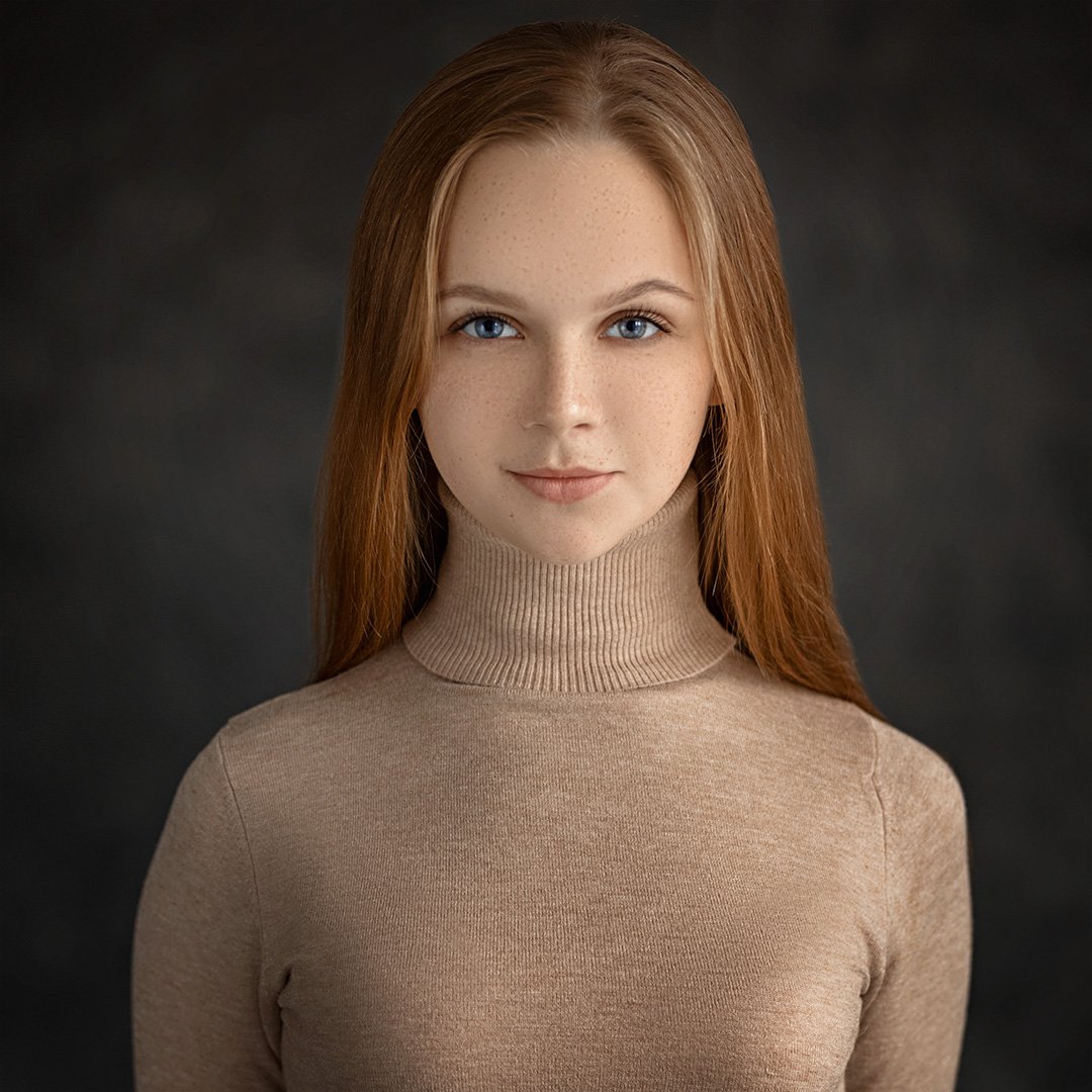 Фотография передаёт спокойную уверенность и естественную красоту модели. Свет акцентирует черты лица, подчёркивая чистоту кожи и выразительность глаз. Нейтральный фон и однотонный наряд создают атмосферу сосредоточенности и элегантности. Работа выполнена в традициях современного арт-портрета, где акцент — на внутреннем состоянии и визуальной гармонии. Фотограф Евгений Сибиряев мастерски использует свет и композицию для создания образа, одновременно простого и глубокого.