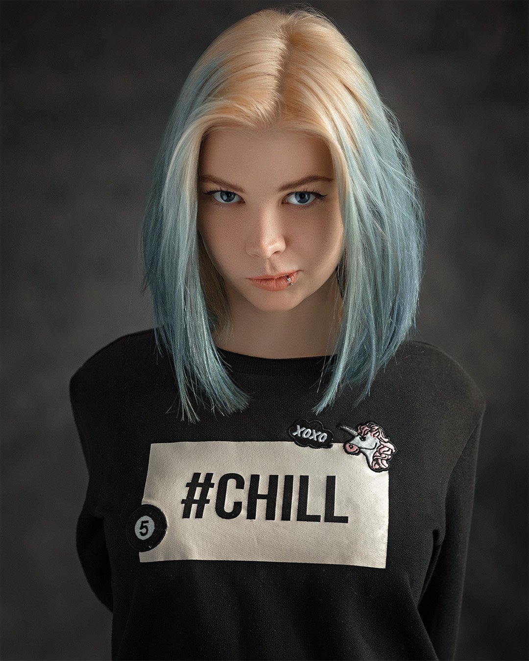 Фотография передает атмосферу современного арт-портрета — холодный свет, четкие контуры и выразительный взгляд модели. Двухцветные волосы, черная одежда с графичным принтом создают образ, балансирующий между повседневностью и художественной выразительностью. Темный фон усиливает фокус на лице и эмоциональной глубине снимка. Работа Евгения Сибиряева демонстрирует мастерство в построении образа и света, характерное для современной портретной фотографии.