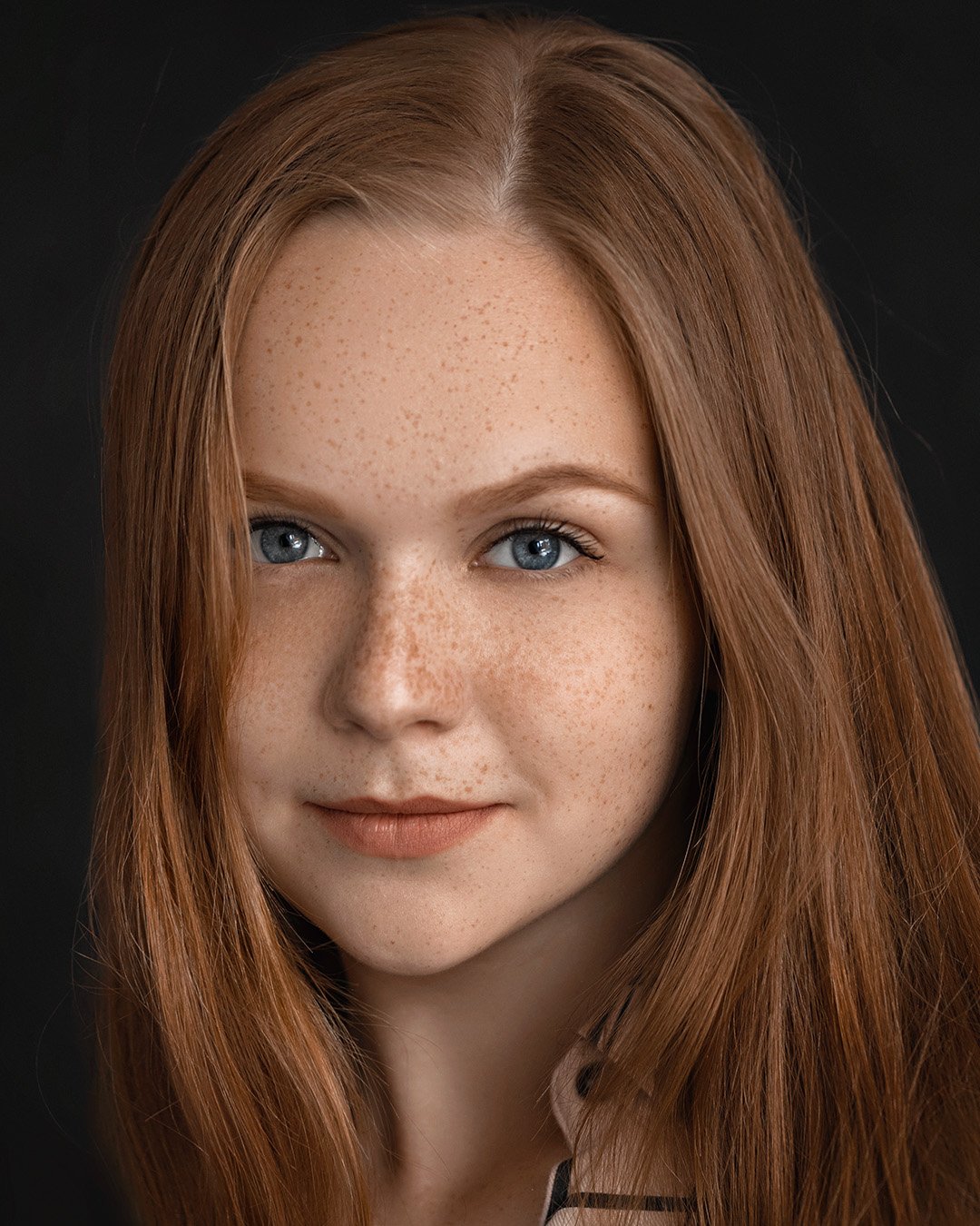 Студийный портрет девушки с выразительными голубыми глазами и ровными рыжими волосами, разделёнными посередине. Тёмный фон подчёркивает чистоту линий лица и естественную красоту модели. Освещение мягкое, направленное, создающее тонкие тени и акцентирующее текстуру кожи с веснушками. Фотография передаёт спокойствие и внутреннюю уравновешенность. Работа Евгения Сибиряева — пример современного арт-портрета с акцентом на детали и цвет.