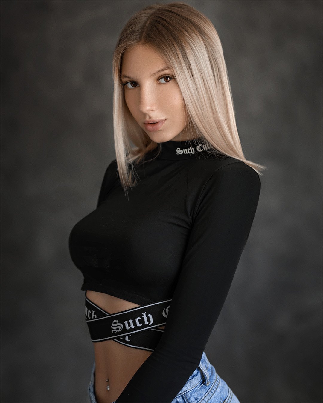 На снимке — Даша, модель в черном облегающем топе с логотипом и джинсах. Темный фон акцентирует внимание на силуэте и выражении лица. Фотограф Евгений Сибиряев передал современный, уверенный образ. Свет мягко моделирует черты, подчеркивая естественную красоту. Снимок — часть арт-портретной серии, где акцент на личности и стиле.