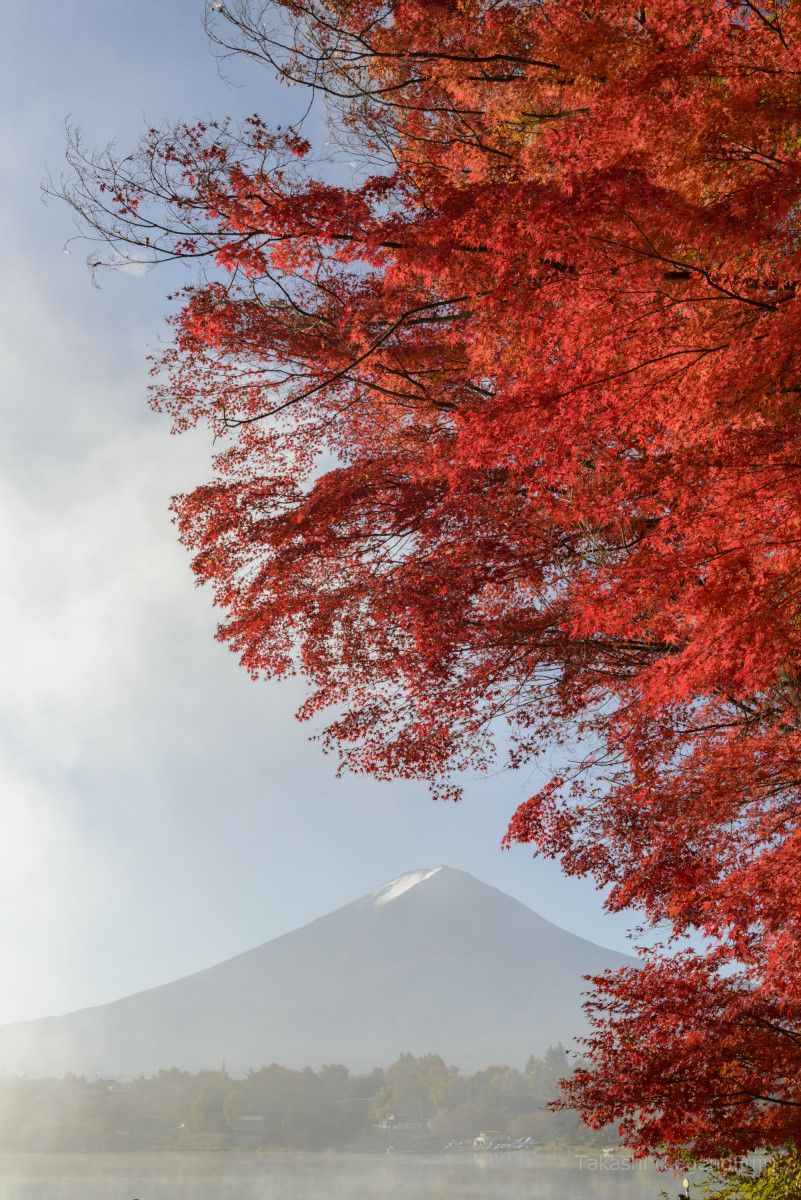 FujimountainJapanautumnmaple.redlakewatertreefoggas