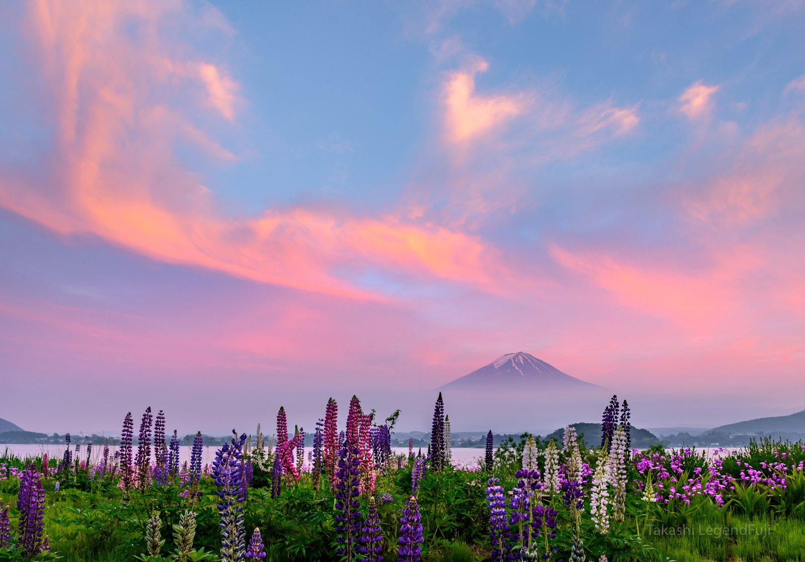 The fog has cleared just before this sunset glow. Mt Fuji was surrounded fog. The cloud in the sky became in pink glow above Lupine. It was beautiful view!!