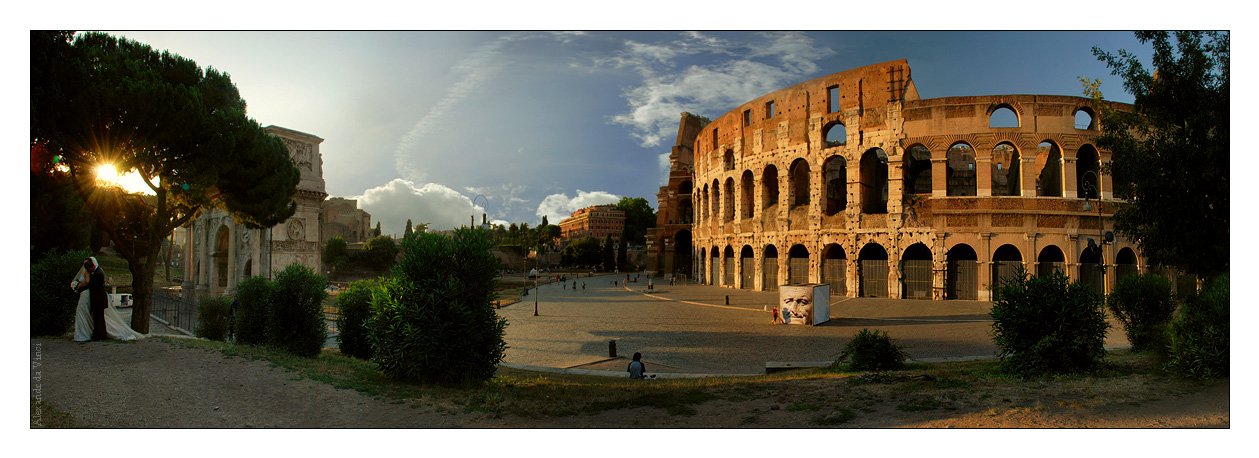 Уже вечерело, поэтому группы туристов переместились еще куда-то. Там днем не пройти, поэтому решил вечером сюда вернуться. Со светом повезо, и со свадебной парой. Нравится, как они смотрятся тут. Жаль вот, что дорога справа проходит. Представлял раньше, что колизей вдали от дорог... А так времени тоже не много было, ракурсы искать некогда, да и уже надо было в Ватикан вернуться, для ночной съемки. Сколько от колизея до Ватикана пешком идти, можете представить :)