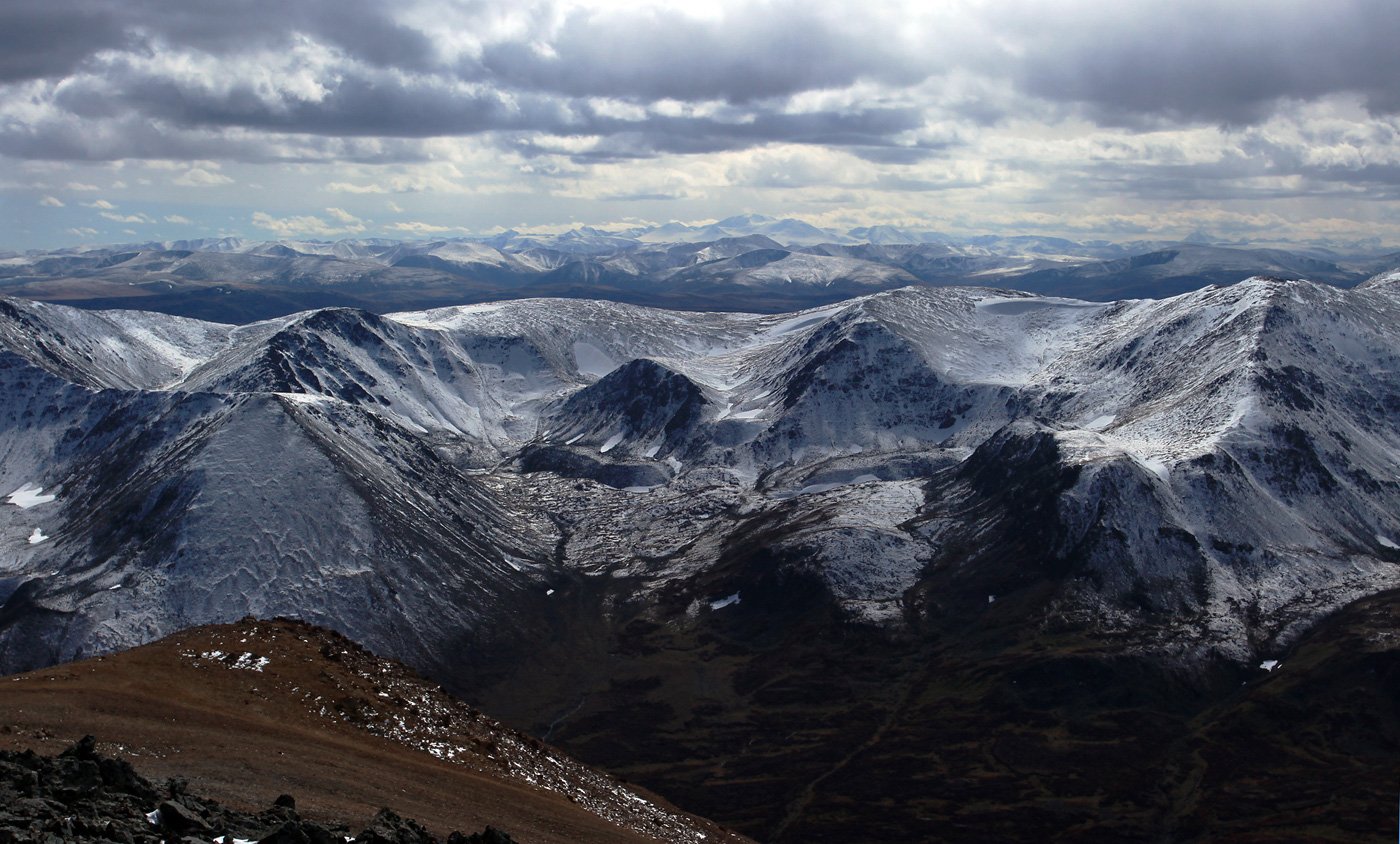 На горизонте плато Укок и Пять Священных Вершин - Табын-Богдо-Ола. Самая высокая из них - Найрамдал (4374 м), вторая по высоте на всем Алтае и одновременно высшая точка Монголии.