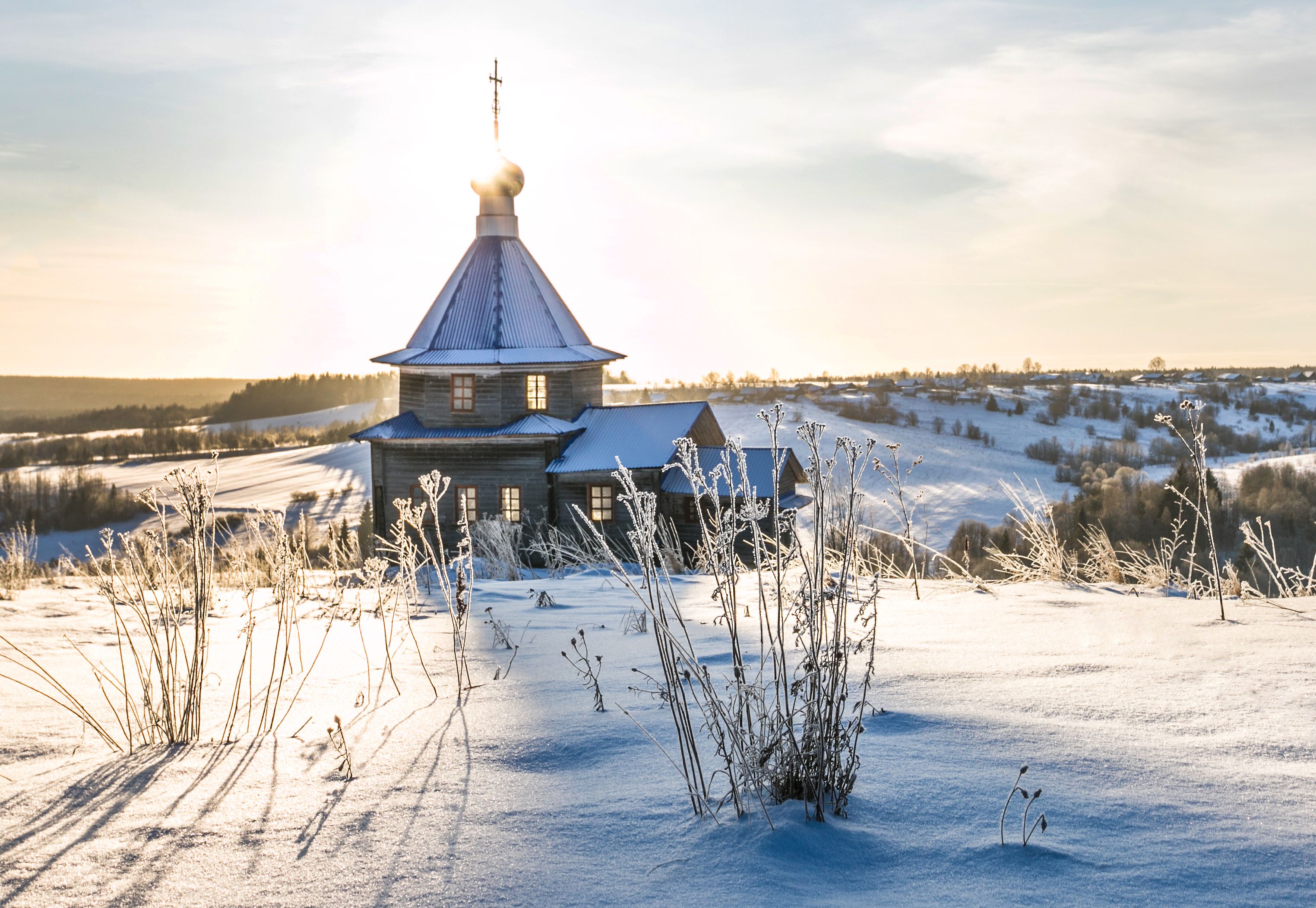 Часовня Зосимы и Савватия, конец 18 в. - начало 19 в. Расположена в одной из красивейших деревень Вельского района - селе Пежма. На высоком холме. Снимок сделан в Рождество Христово. На фото светятся окна часовни. Это солнечный свет наполняет ее через окна, расположенные с противоположной стороны, словно Ангелы этого храма служат свою необыкновенную праздничную службу.