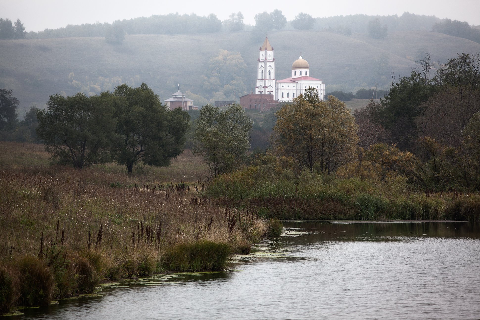пейзаж,лес,озеро,храм,купола,туман, Тамара Андреева