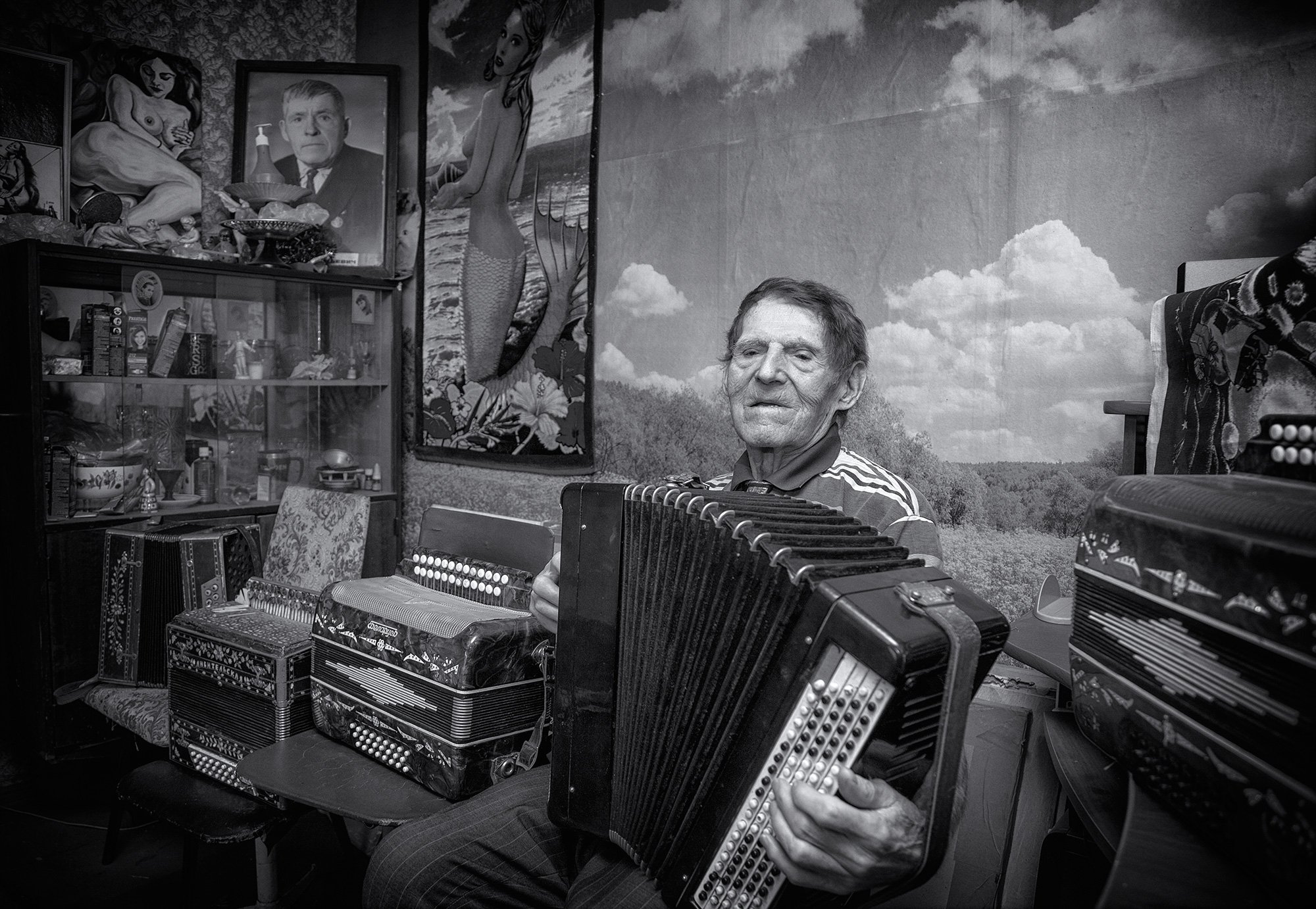 Отличный жанровый портрет! Гармонь и иллюстрации голых женщин навевают мысли, что мужчина тот еще ходок :) Или он гармонист-художник? И нарисовал эти картины? На портрете вроде какая-то награда на пиджаке. Может за Трудовые подвиги!