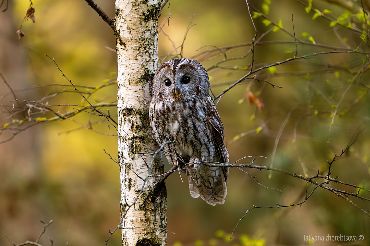 На снимке Татьяны Жеребцовой запечатлена серая неясыть — одна из самых распространённых сов Европы. Птица сидит на белом стволе берёзы, её пестрое оперение идеально гармонирует с текстурой коры и осенним фоном. Этот момент демонстрирует не только красоту дикой природы, но и эволюционное совершенство адаптации: птица остаётся незамеченной даже при близком расстоянии. Осенний лес создаёт тёплую, мягкую атмосферу, контрастирующую с холодным взглядом хищника. Фотография — пример того, как природа сочетает уязвимость и силу в одном кадре.