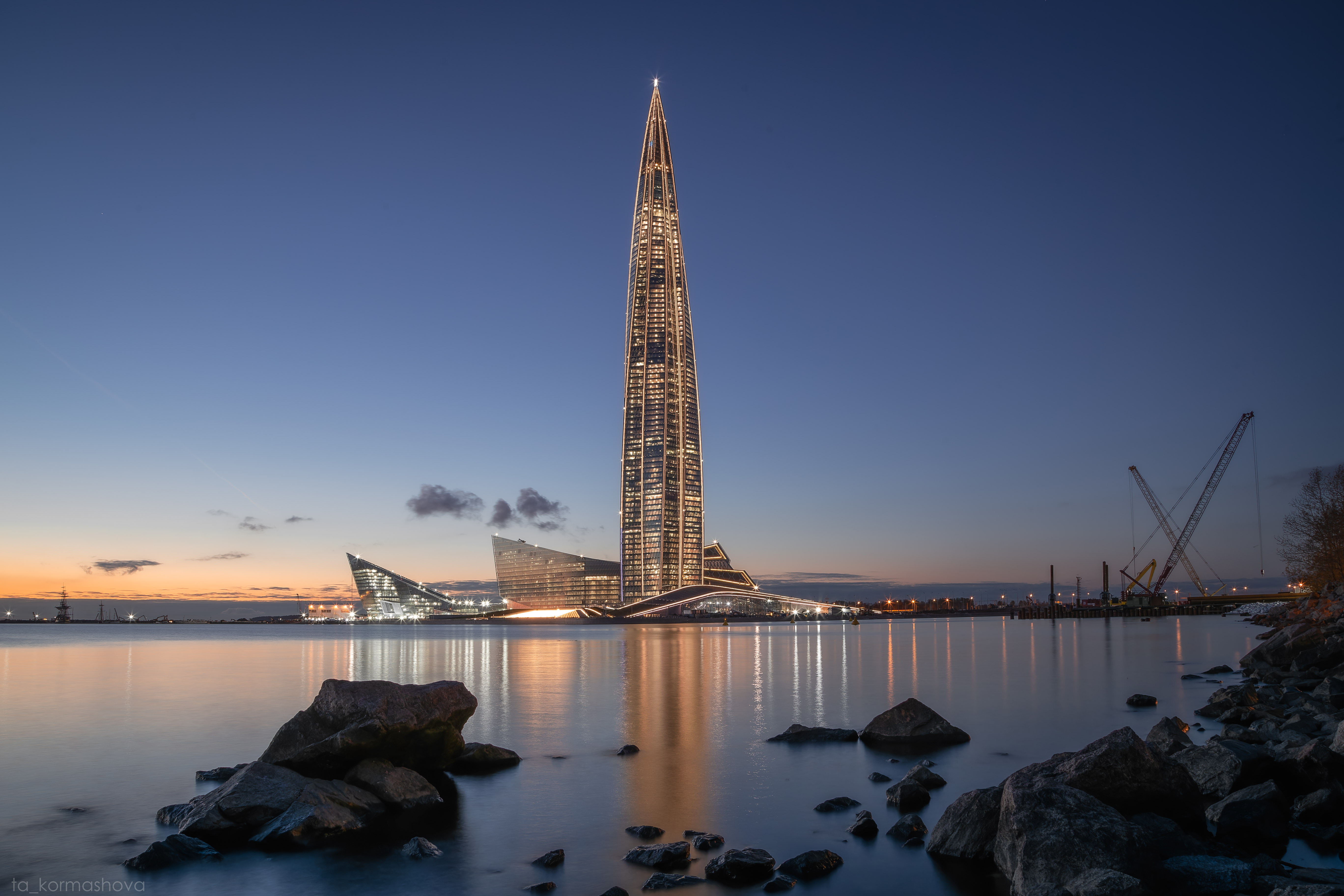 Хороший вечерний кадр — Лахта-центр ярко светится на фоне сумерек, а камни у воды создают ощущение уюта и твёрдости. Видно, что автор уважает место и умеет его передать.