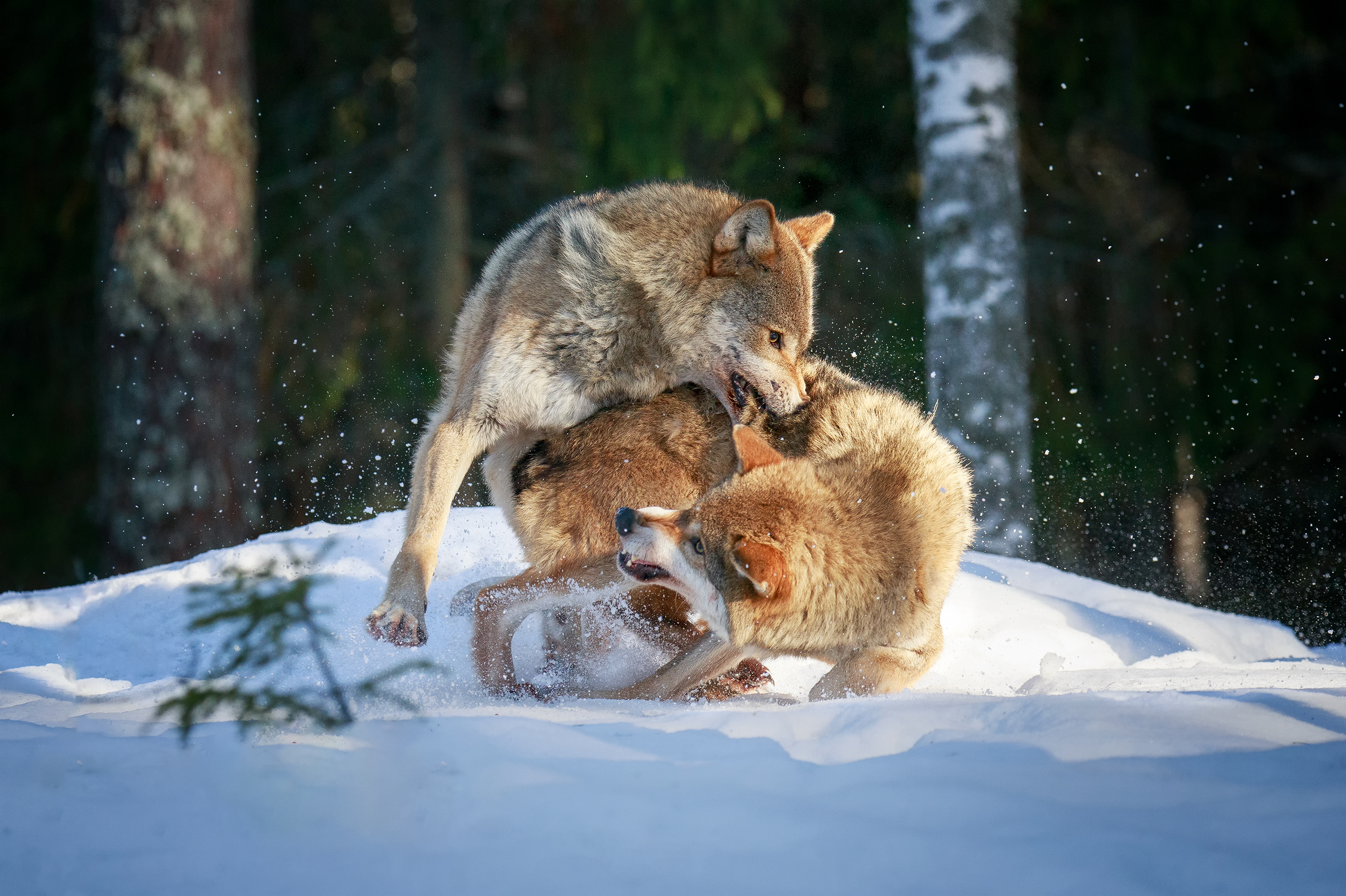 На снимке запечатлён момент взаимодействия двух волков в зимнем лесу. Один лежит на снегу, другой нависает над ним, касаясь мордами — это не агрессия, а социальная игра, характерная для волчьих стай. Снег вокруг брызгает, подчёркивая динамику. На заднем плане — силуэты деревьев, включая берёзы, что добавляет глубину кадру. Фотография передаёт естественное поведение животных в их среде обитания, подчёркивая гармонию и силу дикой природы. Снимок — часть серии, посвящённой жизни волков в условиях суровой зимы.