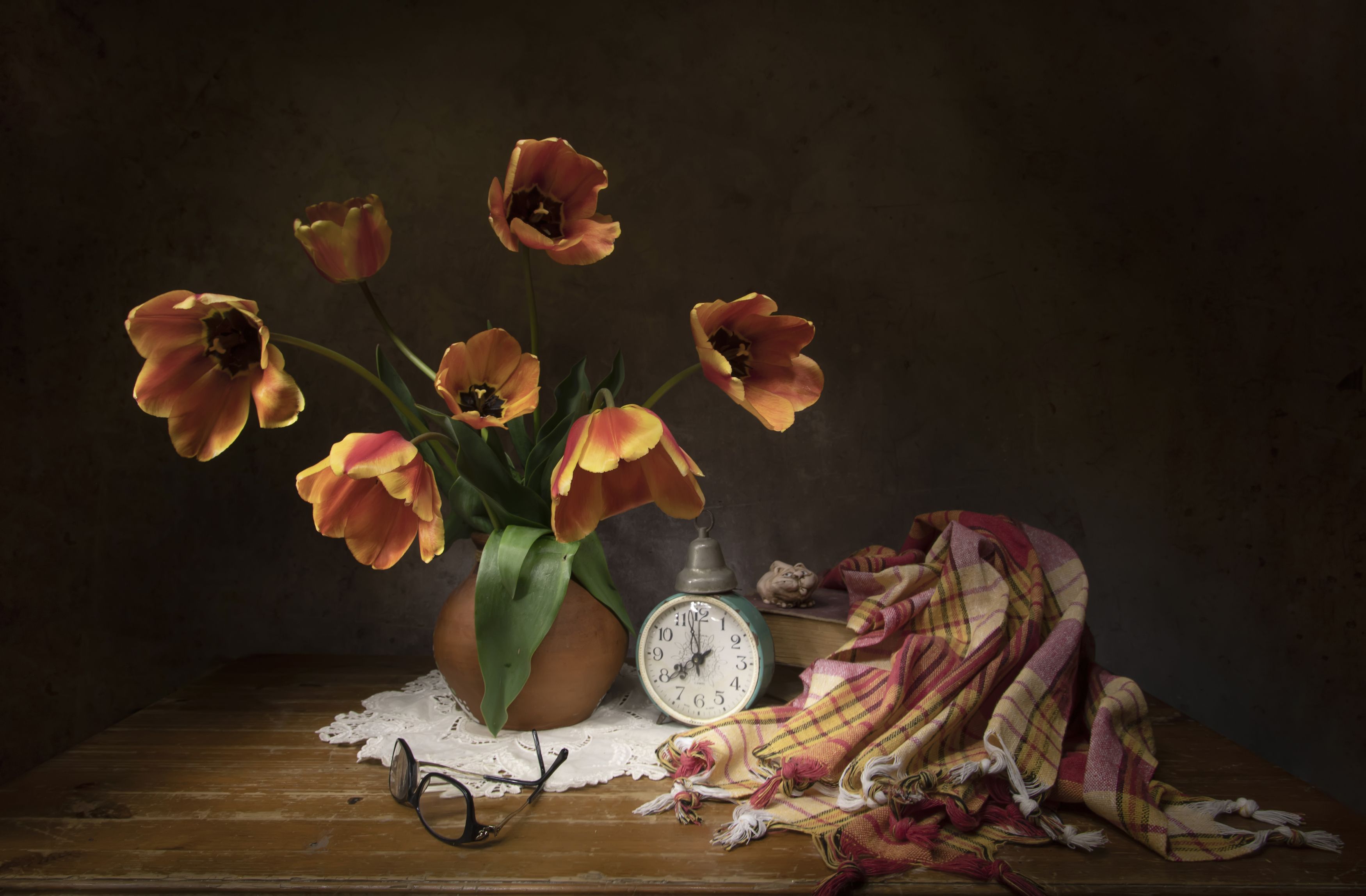 На деревянном столе — букет оранжевых тюльпанов, уже склонившихся к земле. Рядом — потёртый платок, очки и будильник, чьи стрелки будто замерли. Это не просто композиция — это история о том, как быстро проходит красота, и как мы пытаемся удержать мгновения в тишине. Работа Татьяны Феденковой говорит без слов: время идёт, но память остаётся.