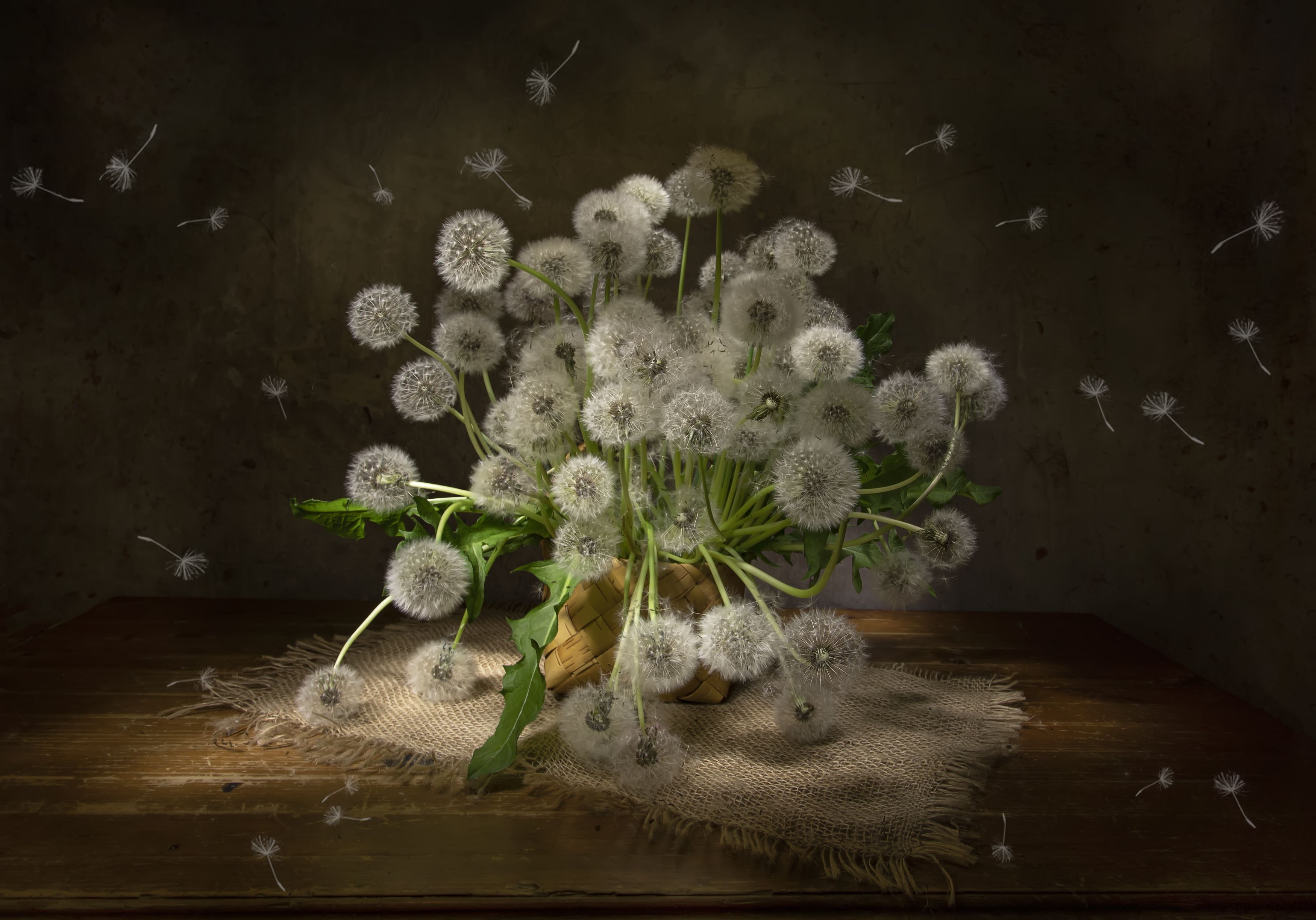 На старом деревянном столе стоит ваза с одуванчиками, чьи пушистые головки уже готовы к полёту. Свет мягко освещает сцену, подчёркивая тонкие стебли и рассеянные в воздухе семена. Каждый элемент — от текстуры дерева до тени на стене — вносит в композицию ощущение тишины и уходящего времени. Это не просто цветы — это момент, застывший в мгновении, когда природа готовится к новому циклу.