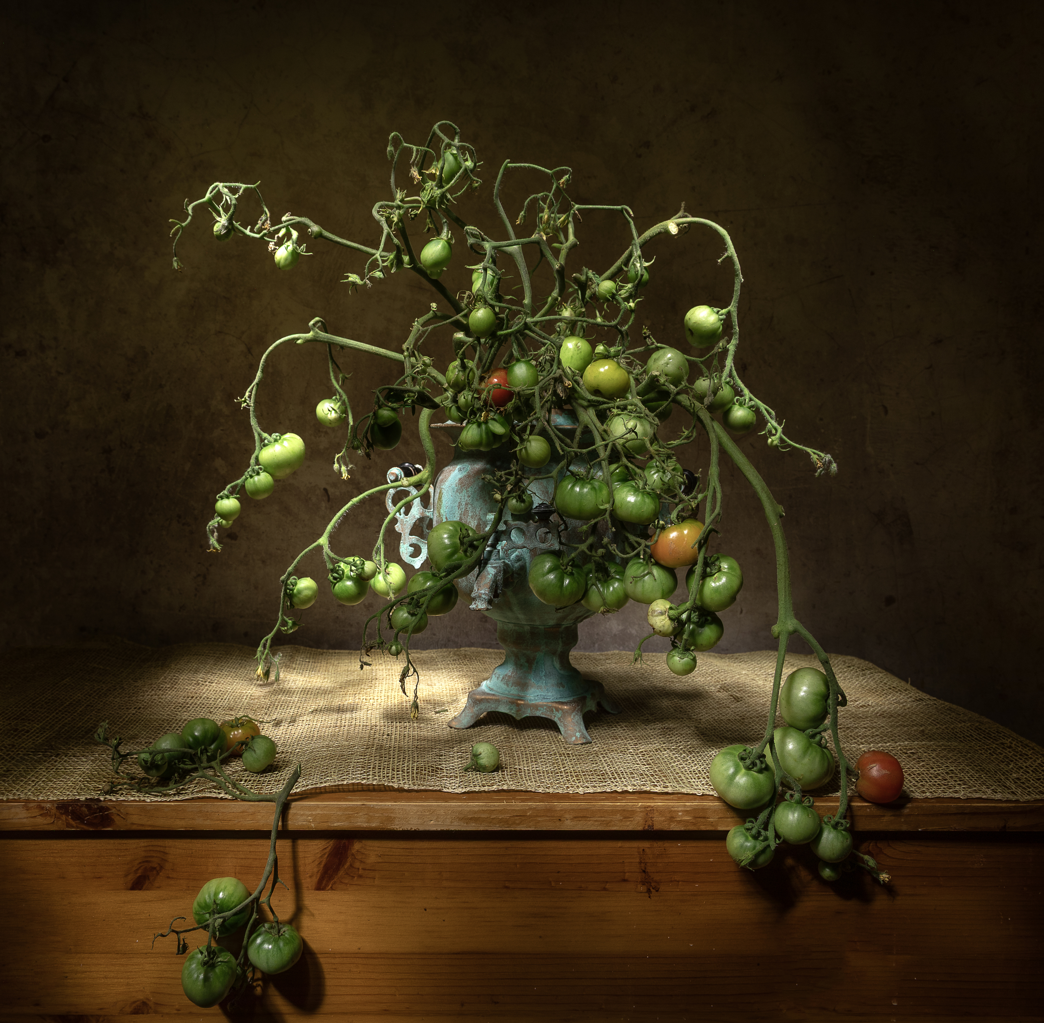 Татьяна, снимок получился очень выразительным — натюрморт с помидорами в вазе, как будто застывший в моменте, когда природа уже уходит, но ещё не ушла. Свет ложится точно — подчёркивает текстуру ветвей, зелёные и чуть покрасневшие плоды, старинный оттенок вазы. И бurlap под ней — как будто всё это лежит в сарае, где время замедлилось.