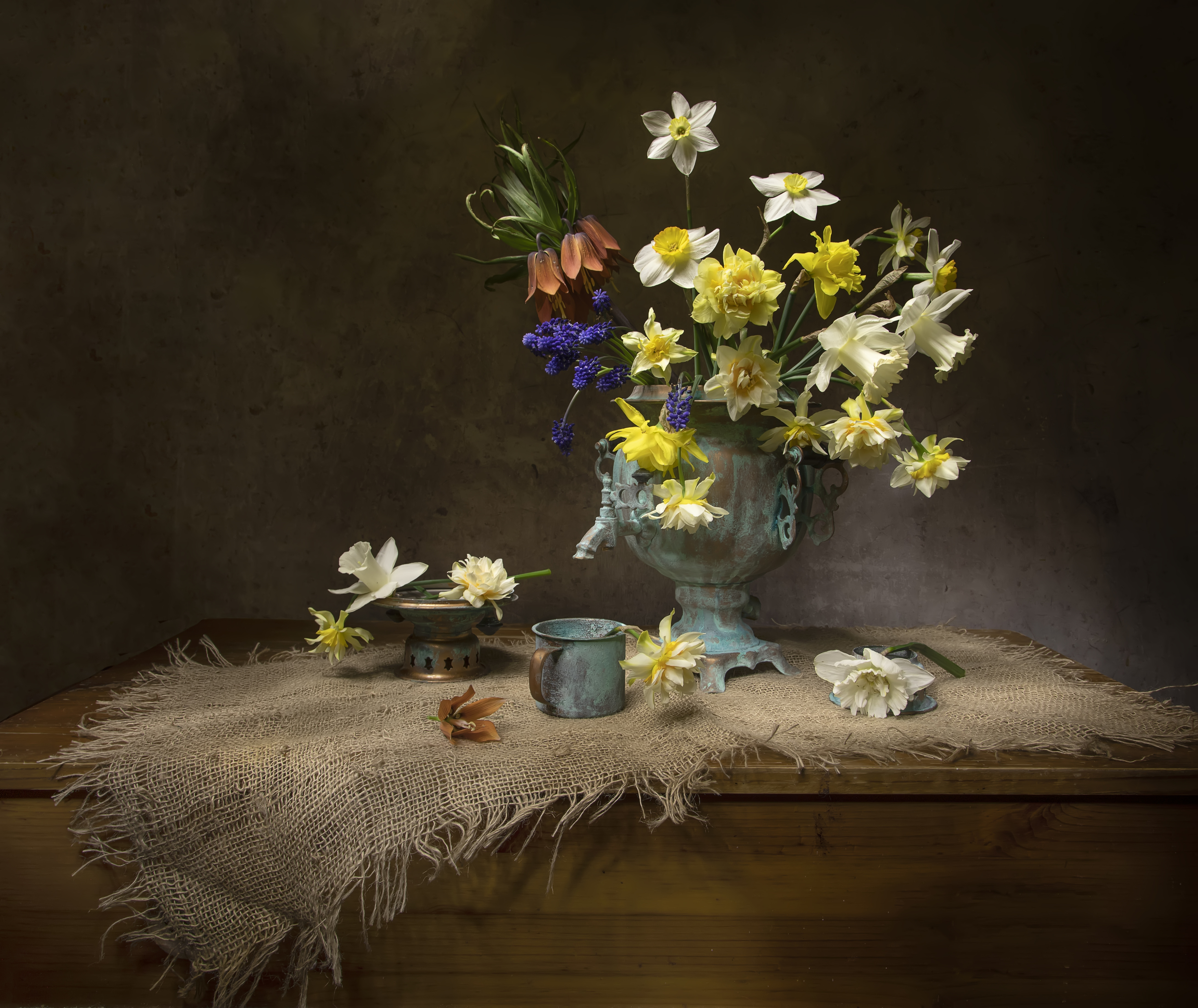 Вы создали уютный натюрморт, где весенние цветы — нарциссы, мускари, рябчик — гармонично сочетаются с самоваром и старинной посудой. Композиция выдержана в тёплых, приглушённых тонах, что придаёт сцене спокойствие и домашний уют.