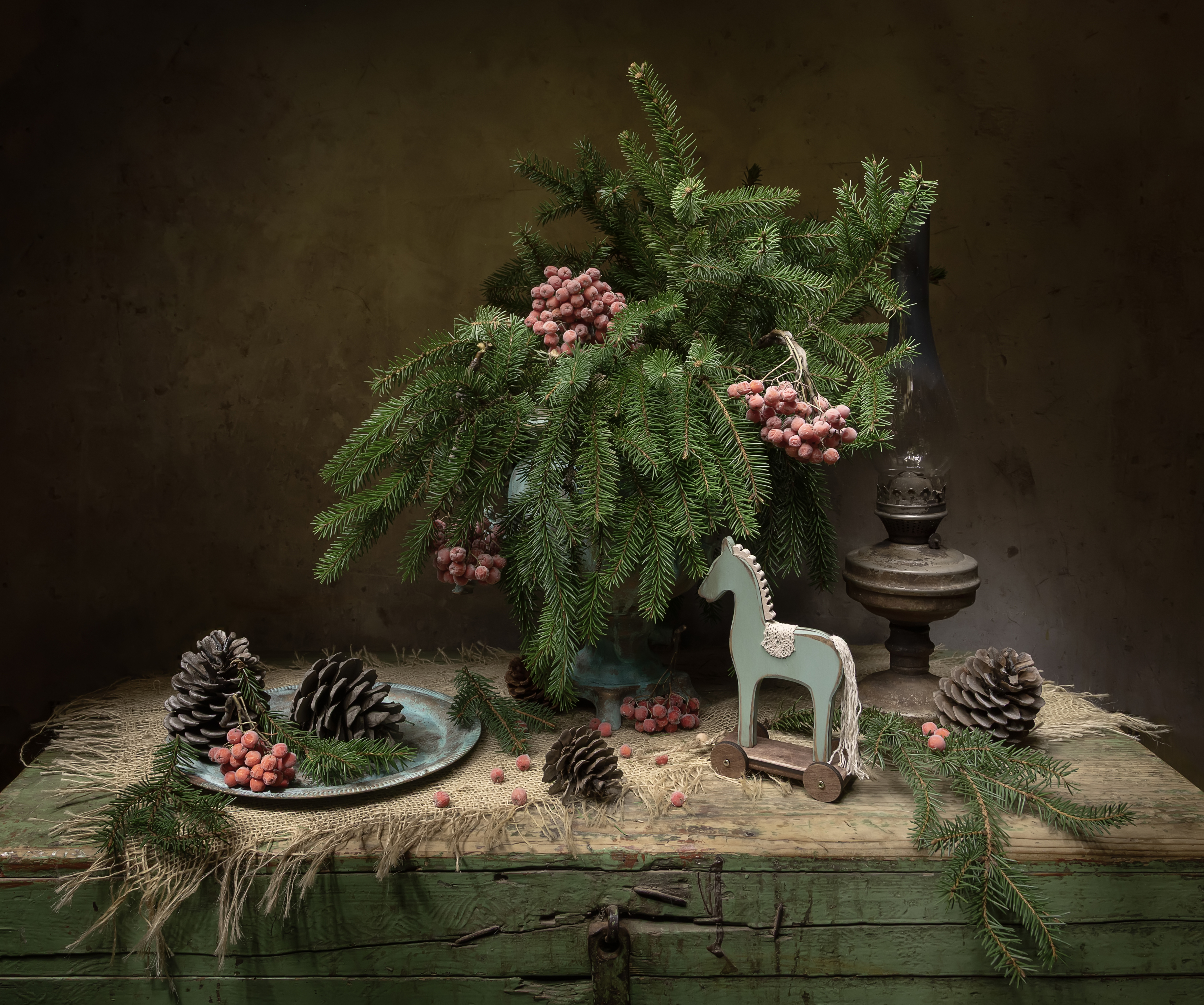 Вы создали атмосферный натюрморт, где ель, рябина и керосинка ведут диалог с прошлым. Старый сундук, лошадка и шишки — как символы уходящего времени. 🌲🕯️🐴