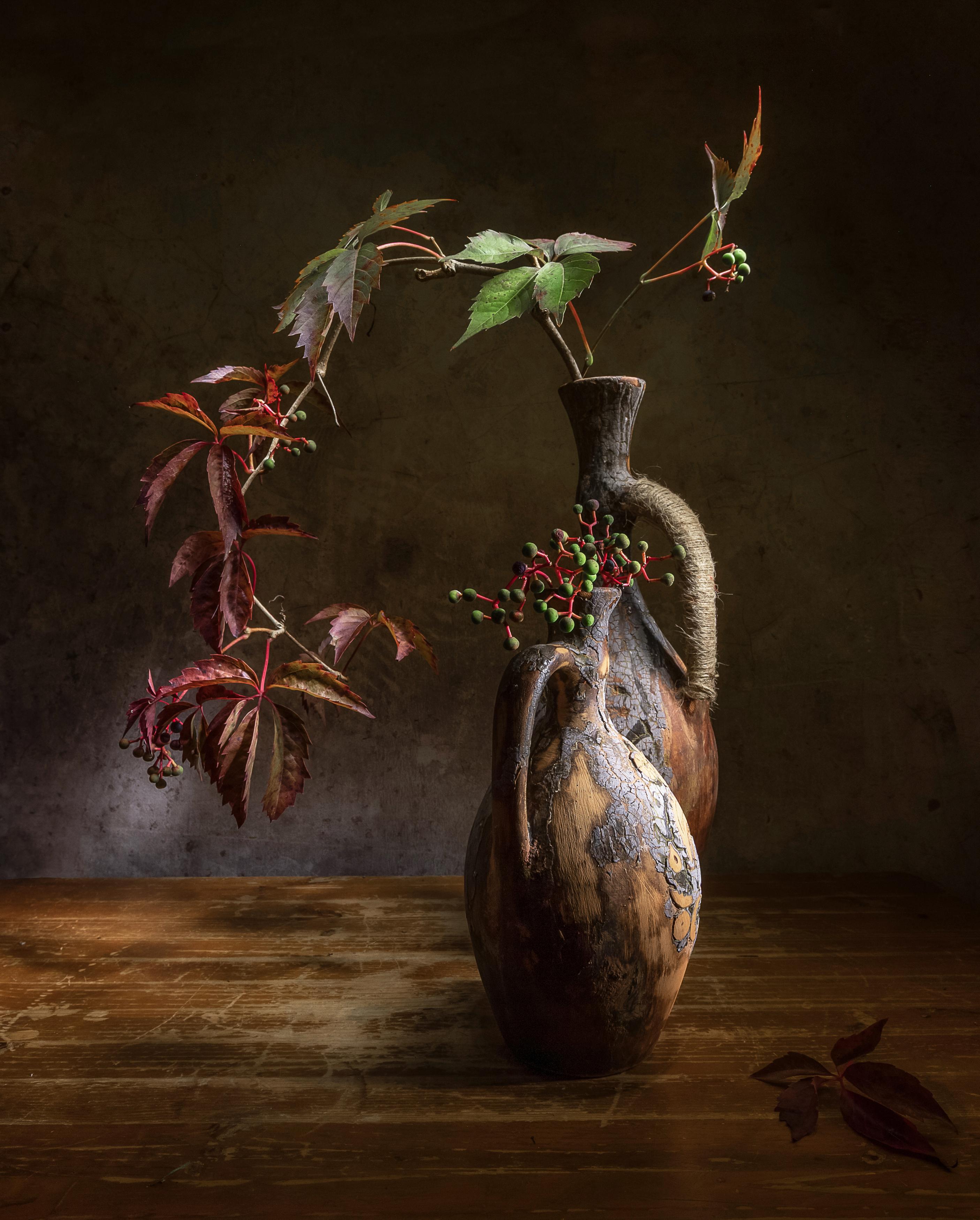 Татьяна, спасибо за снимок — очень атмосферно получилось. Эти веточки девичьего винограда с красными и зелёными листьями, да ещё в такой старинной, потёртой кувшине — будто из сказки.