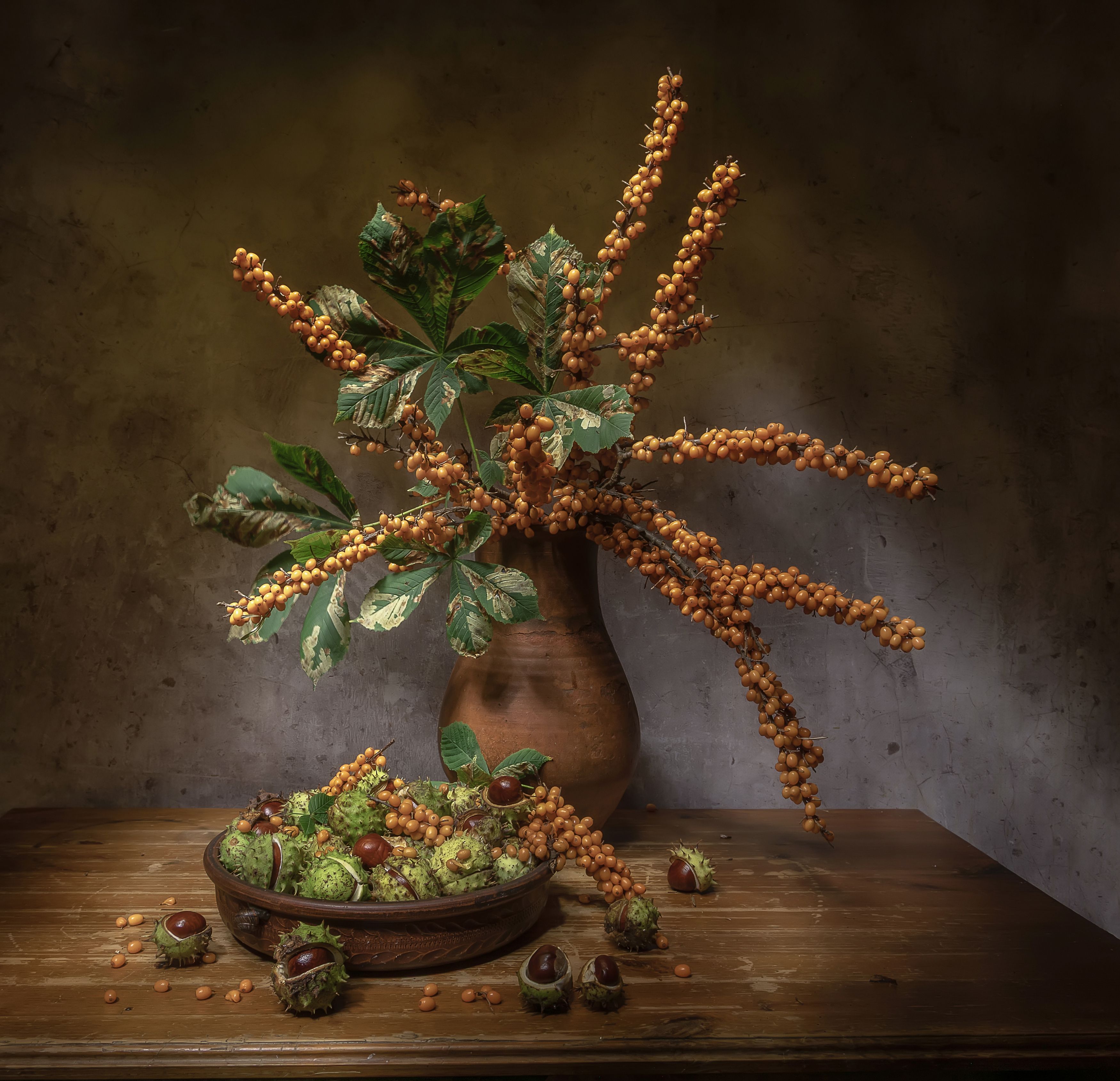 Вы хорошо передали атмосферу осени — облепиха и каштаны в тёплых тонах, текстура глиняного кувшина и деревянного стола создают уютный, почти классический натюрморт. Свет мягкий, акценты на яркости ягод и зелени листьев — удачно. Получилось неплохо.