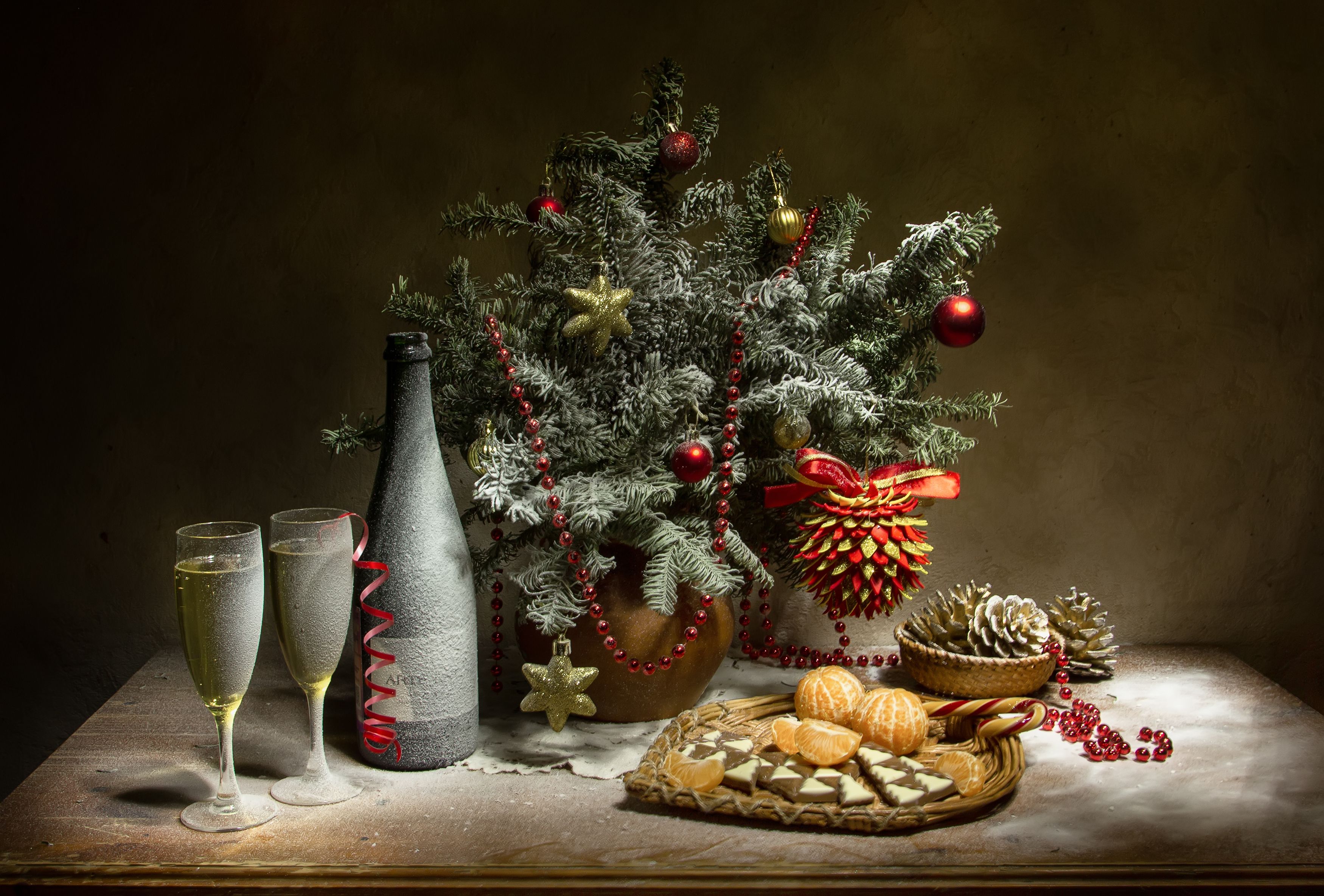 натюрморт, ель, шампанское, бокалы, игрушки, мандарины, шоколад, Татьяна Феденкова