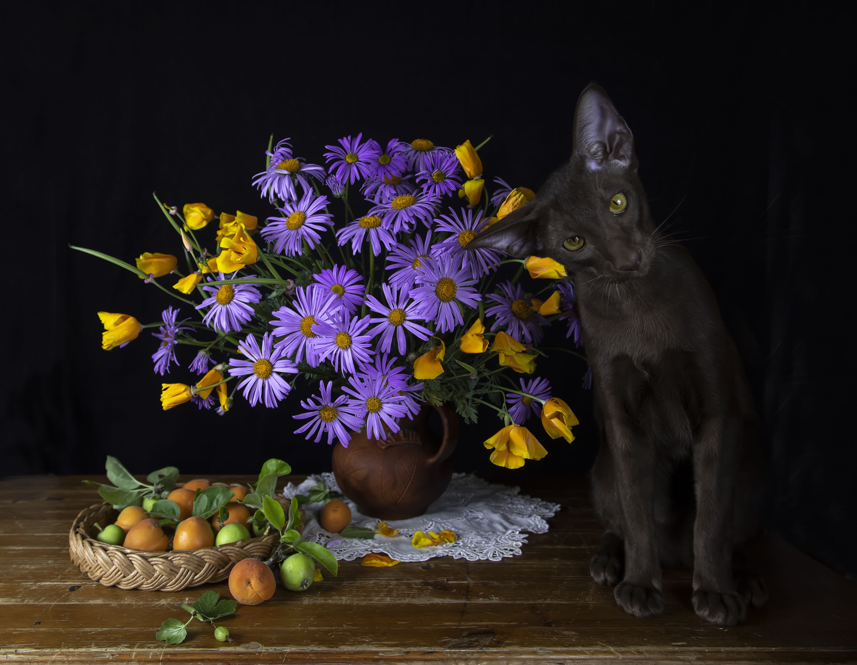 натюрморт, ромашки, эшшольция, абрикосы, яблоки, кот, ориентал, Татьяна Феденкова