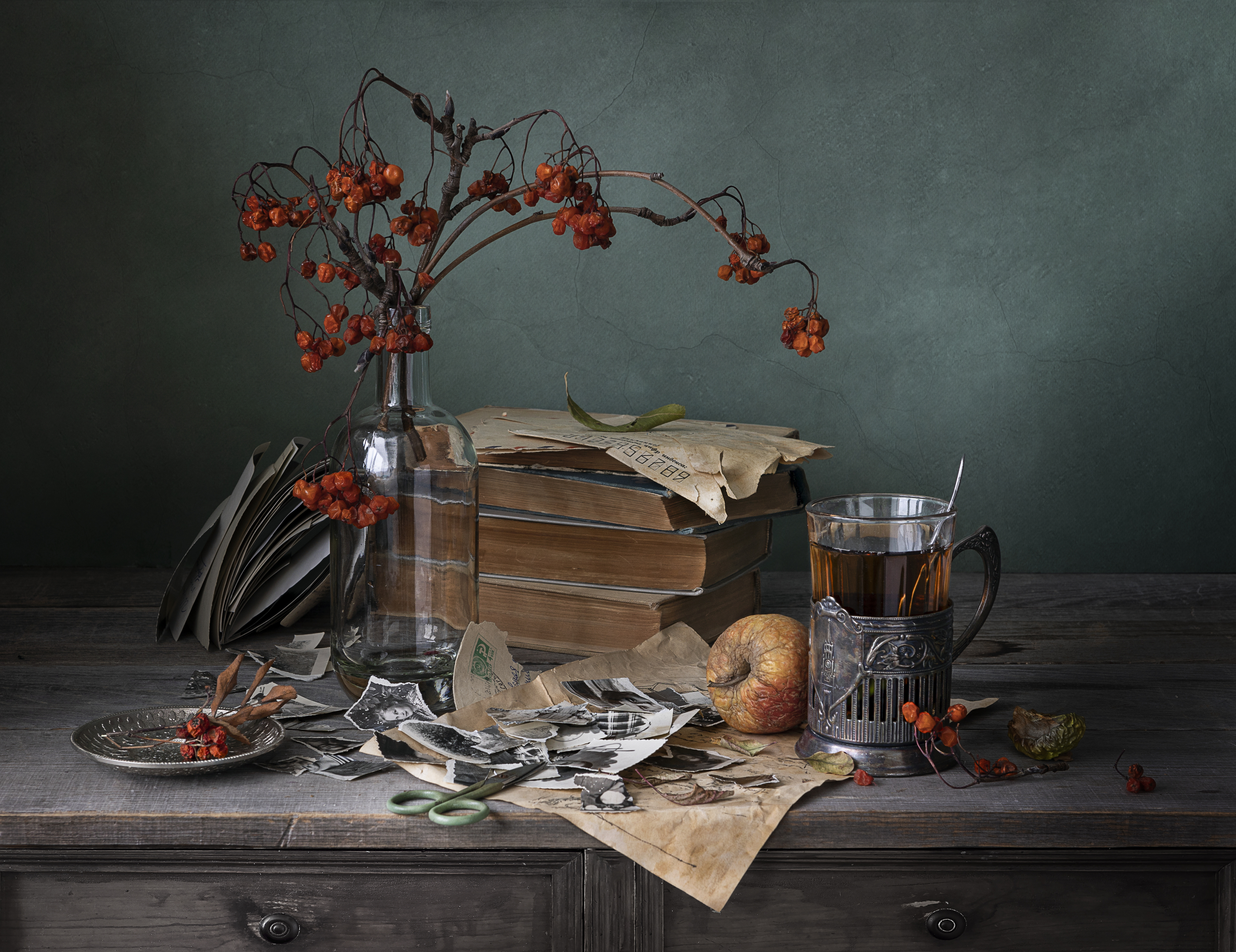 Татьяна, вы мастерски передали атмосферу тихого раздумья — старые книги, рассыпанные фотографии, яблоко и плоды на ветке… всё словно замерло в момент вспоминания. 🍂