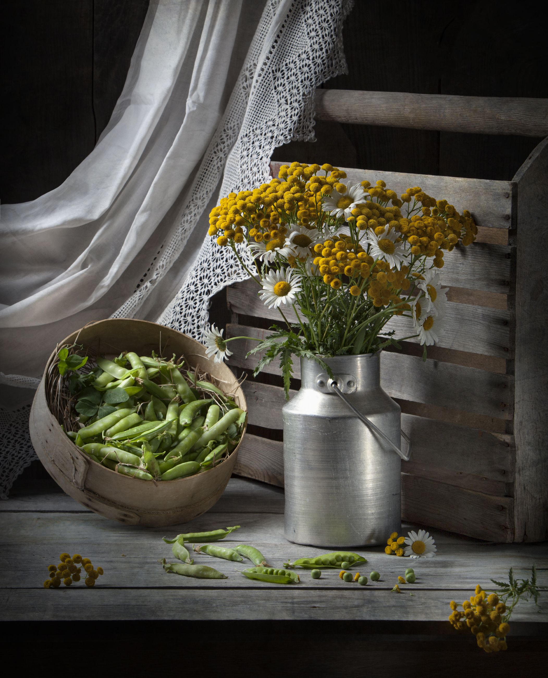 горох, сито, бидон, цветы., Татьяна Попова