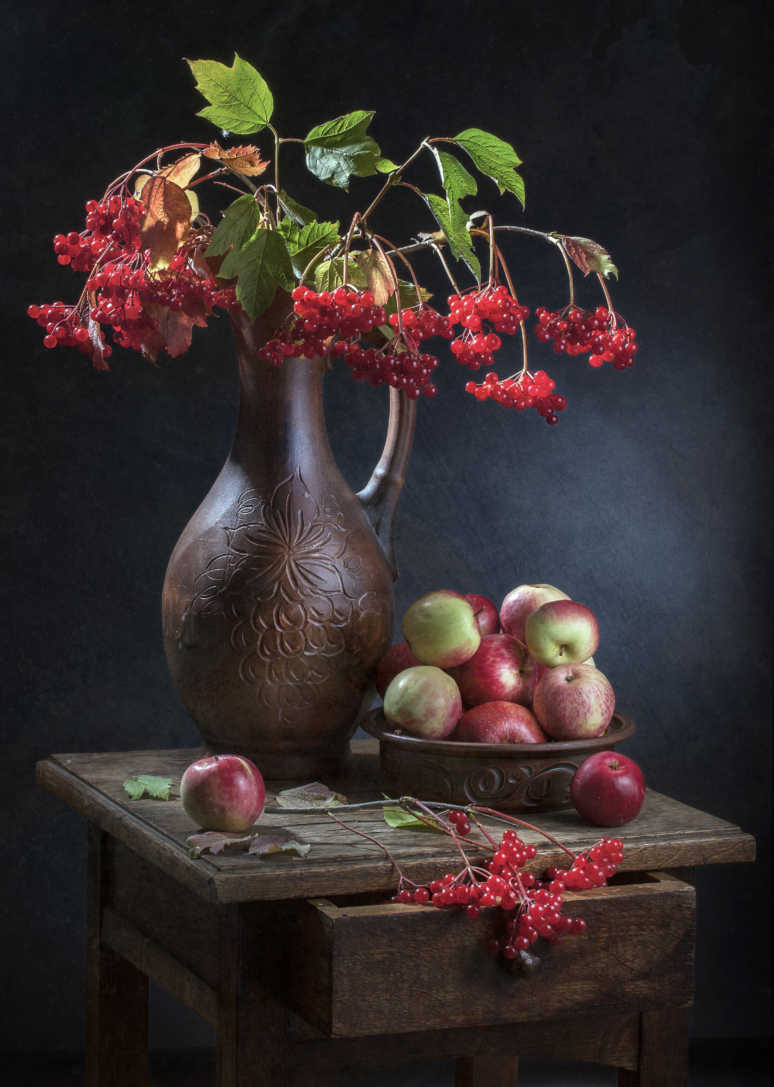 калина, яблоки, кувшин, тарелка., Татьяна Попова