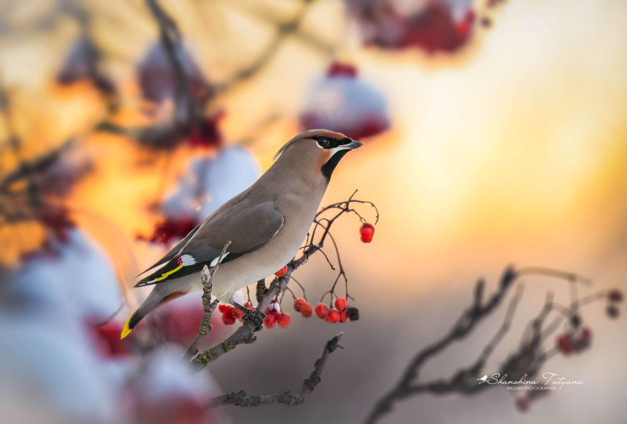 Солнце уже спряталось, но свет ещё лежит на ветке — птица сидит, как в сказке, и будто замерла в моменте. Красные ягоды, тёплый фон, чёткий силуэт — всё смотрится естественно и красиво. Хорошо поймана атмосфера вечера. Татьяна, спасибо за снимок — он тёплый и живой.