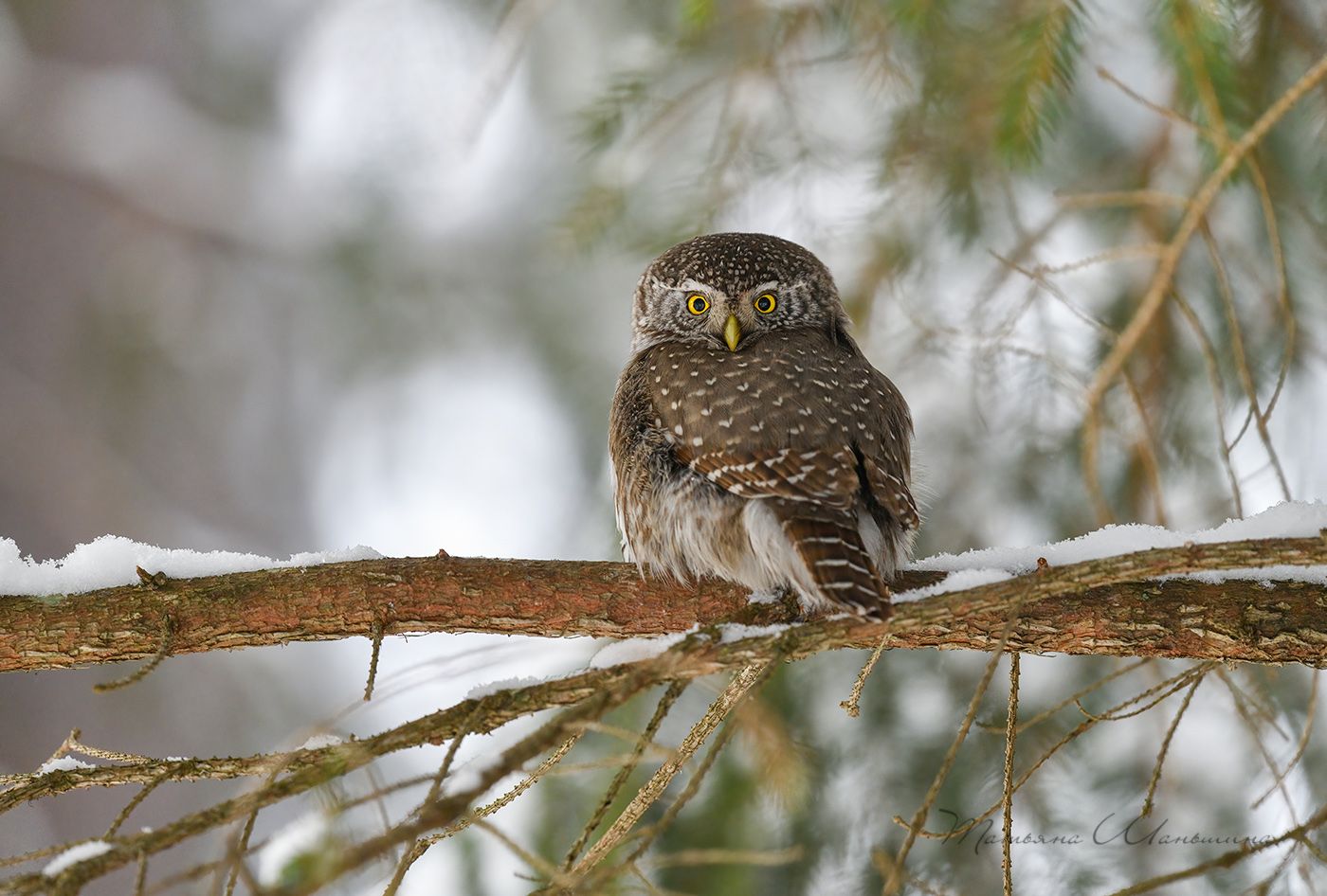 Воробьиный сыч - самая маленькая сова. Он отличный охотник на мышей и мелких птах. Абсолютно бесшумный полет, делает его атаку незамеченной, а цвет оперения помогает замаскироваться под окружение.