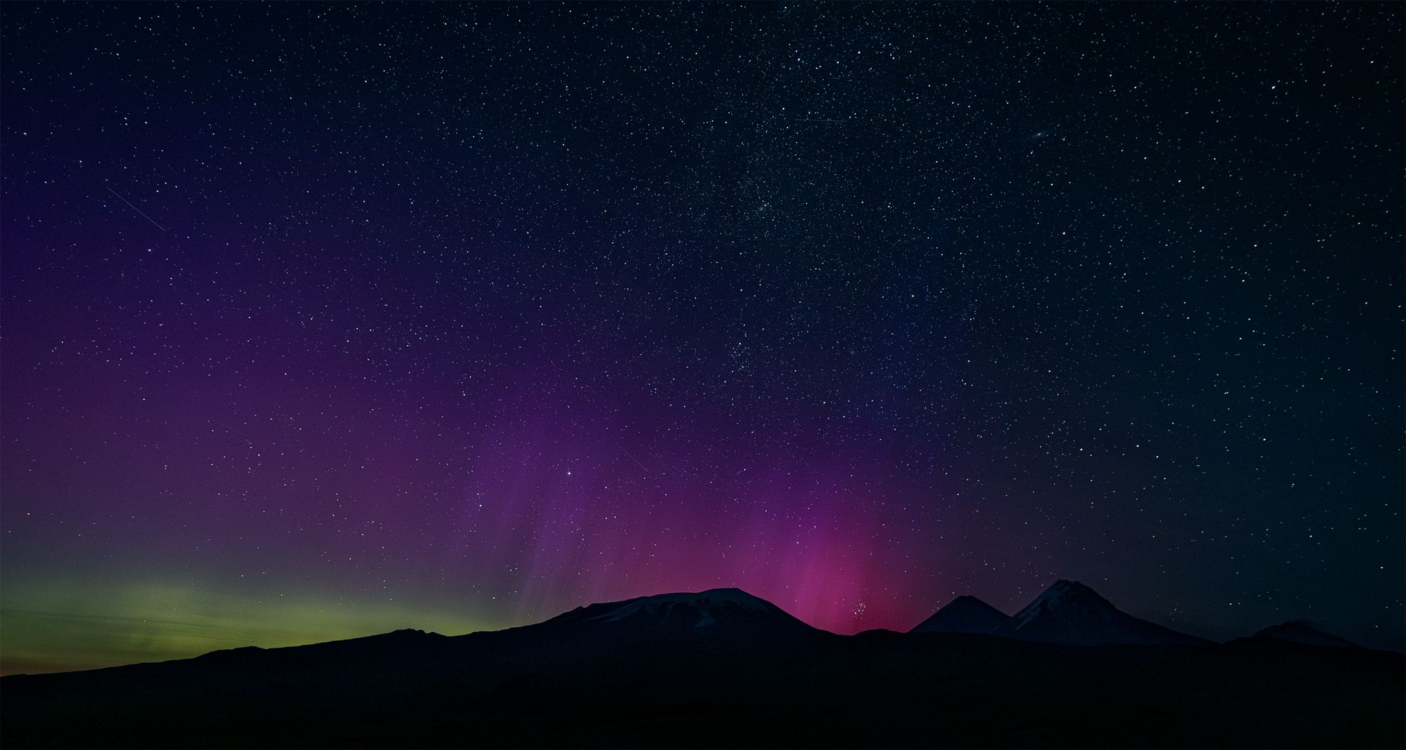 Начало нашего фототура ознаменовалось невероятной съемкой: после вкусного ужина мы остались фотографировать Млечный Путь, когда неожиданно началось полярное сияние. Этот момент случился в "Долине великанов", с потрясающим видом на вулканы Камчатки. На фото слева направо: Ушковский, Ключевской, Камень и курящийся Безымянный. Камчатка, Август 2024.