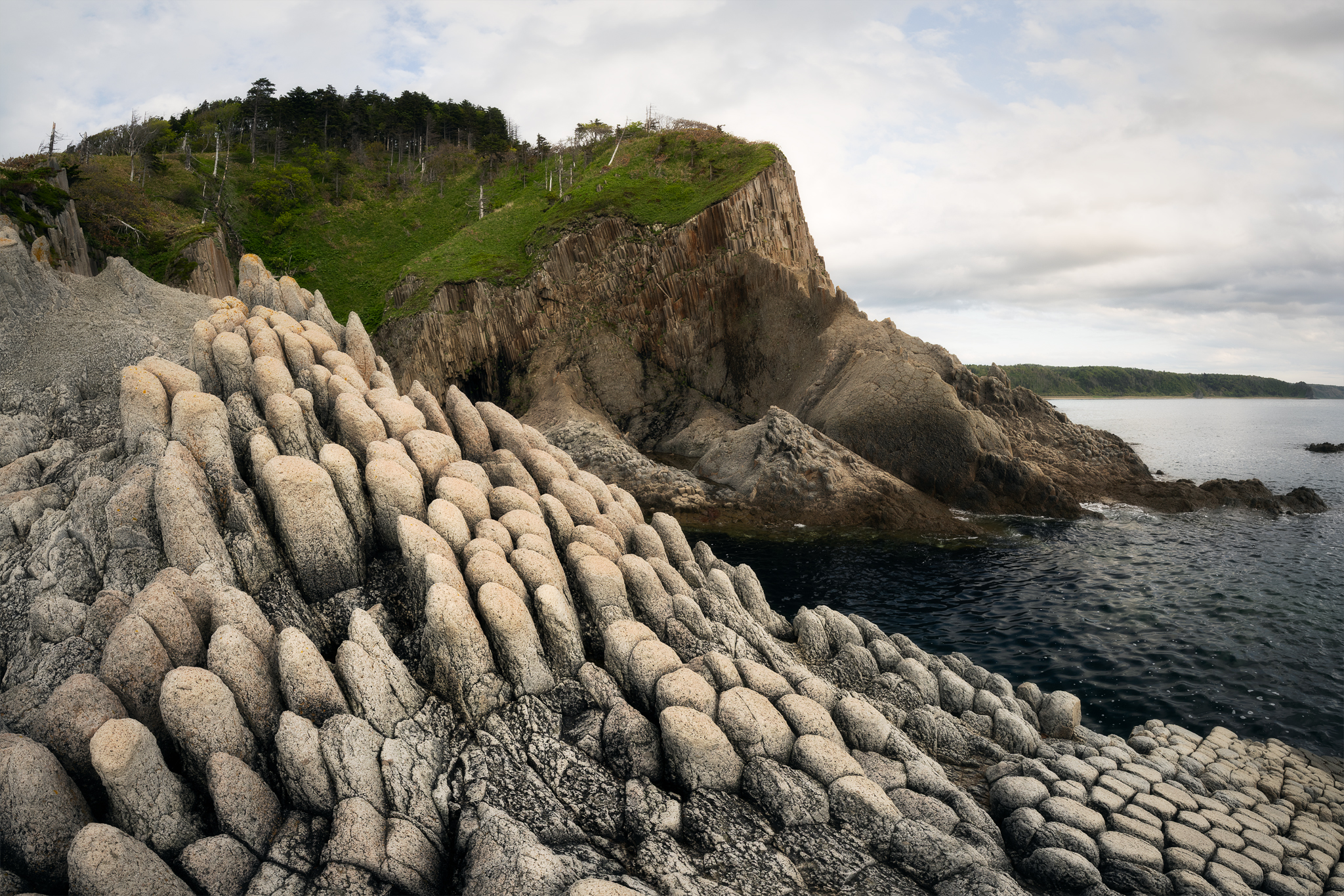 Последствия извержения вулкана Менделеева на острове Кунашир. Стекающая лава соприкасаясь с морем застывала в виде столбиков.