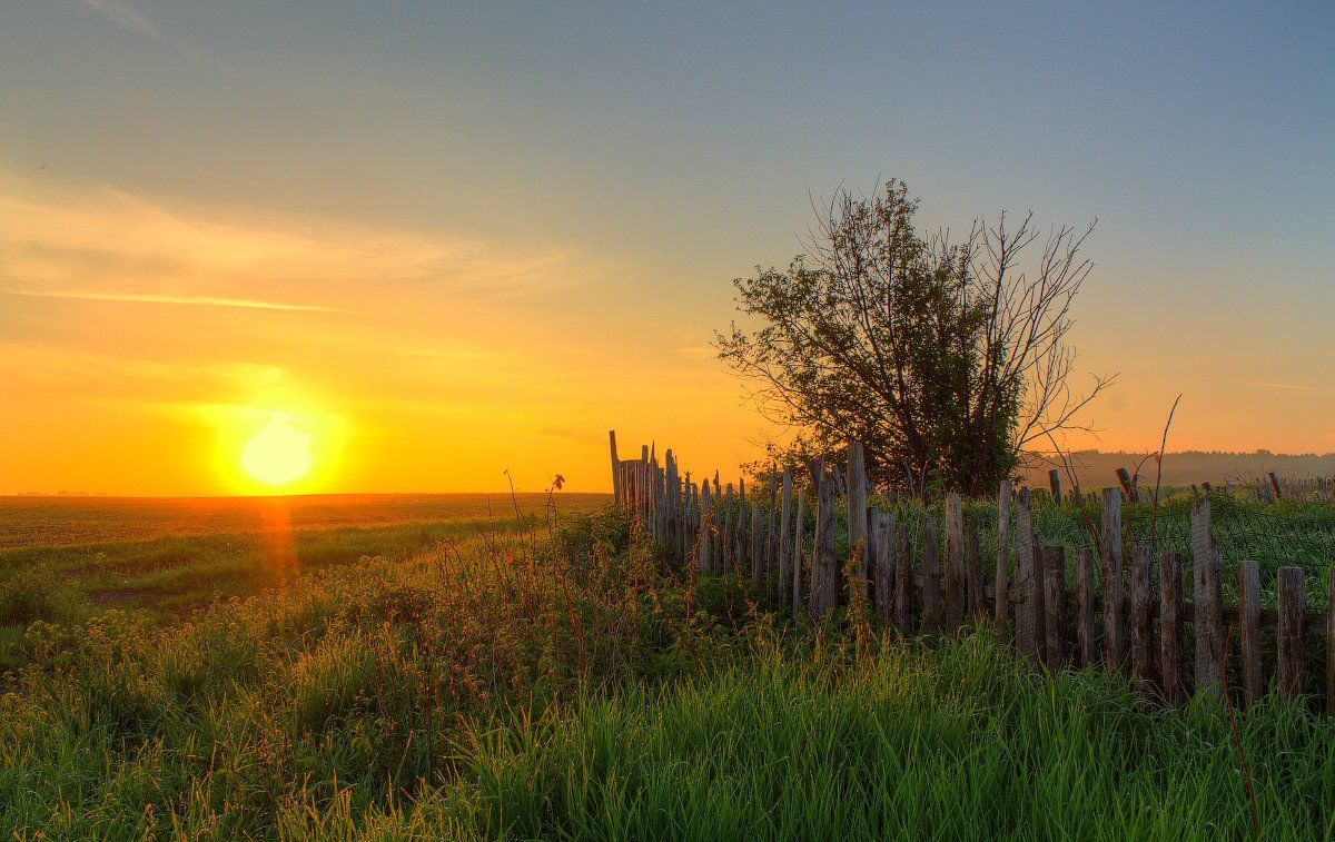 забор, лето, небо, облака, пейзаж, природа, рассвет, свет, солнце, трава, Артём Колупахин