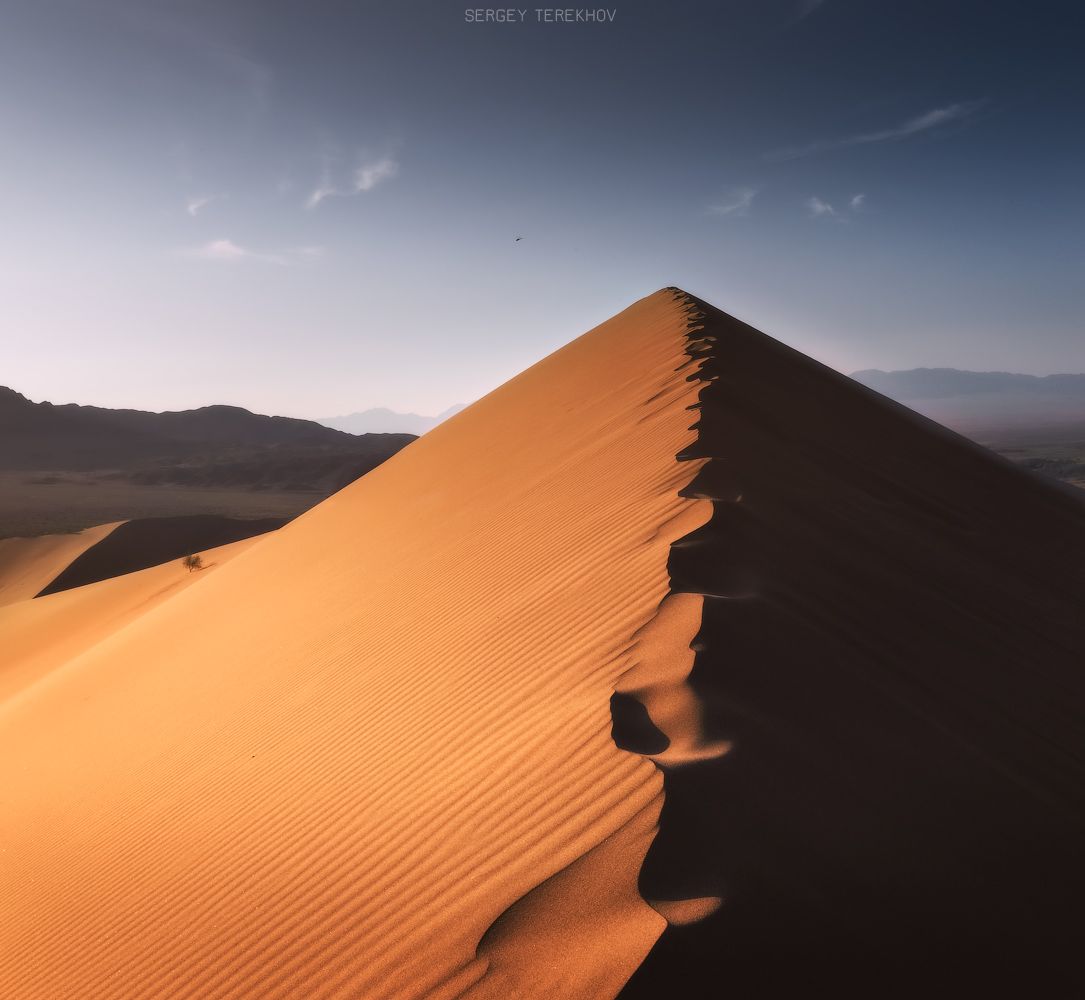 Первым был в нашем маршруте "Поющий бархан" в парке Алтын Емель. Мы посидели, полежали и повалялись на теплом песке гребня горы, почти в самой высокой точке бархана, около часа. Смотрели как садится солнце за гору малый Калкан. Как на горизонте утопающая в зелени река Или, заливалась мягким уходящим солнечным светом. Видели сильные порывы ветра, сдувающие песок с гребней бархана, создавая песчаные облачка. Смотрели как вечерние лучи солнца меняют цвет песка, от бледно-желтого до мягко-оранжевого. Запускали руки в песок и делали маленькие песчаные лавины вызывая грозную гудящею песню бархана.