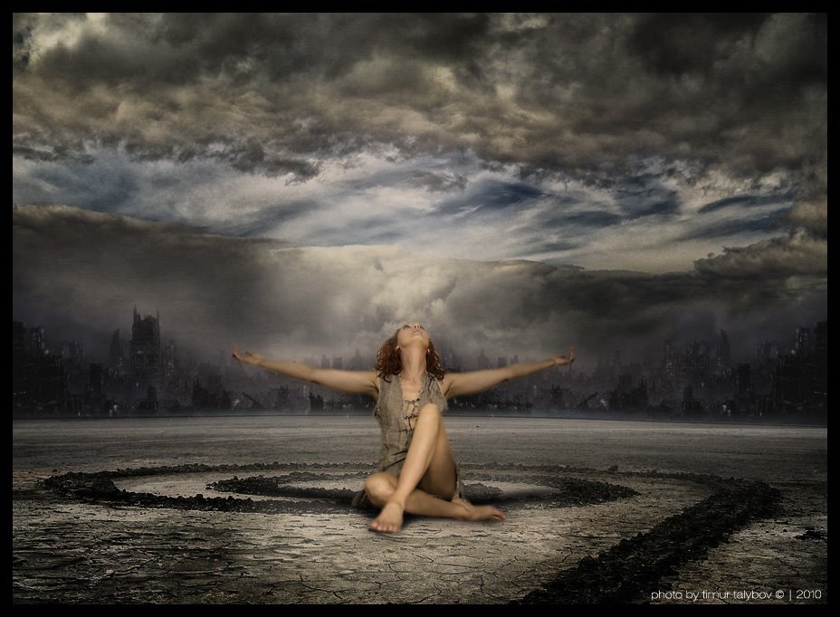 В коллаже использованы фотографии земли и разрушенного города неизвестных авторов, небо и фото модели мои.