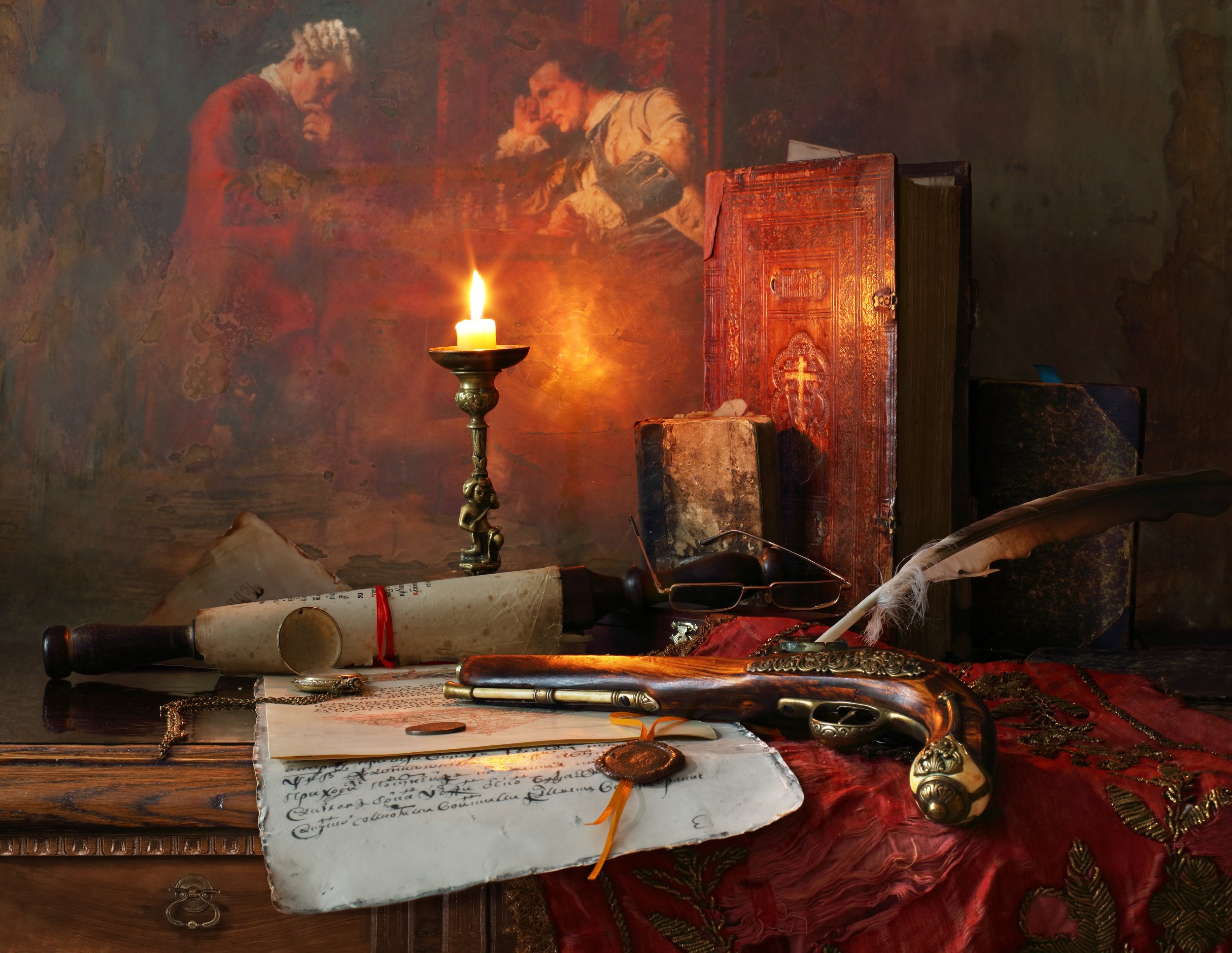 свеча, книги, свиток, пистолет, Андрей Морозов