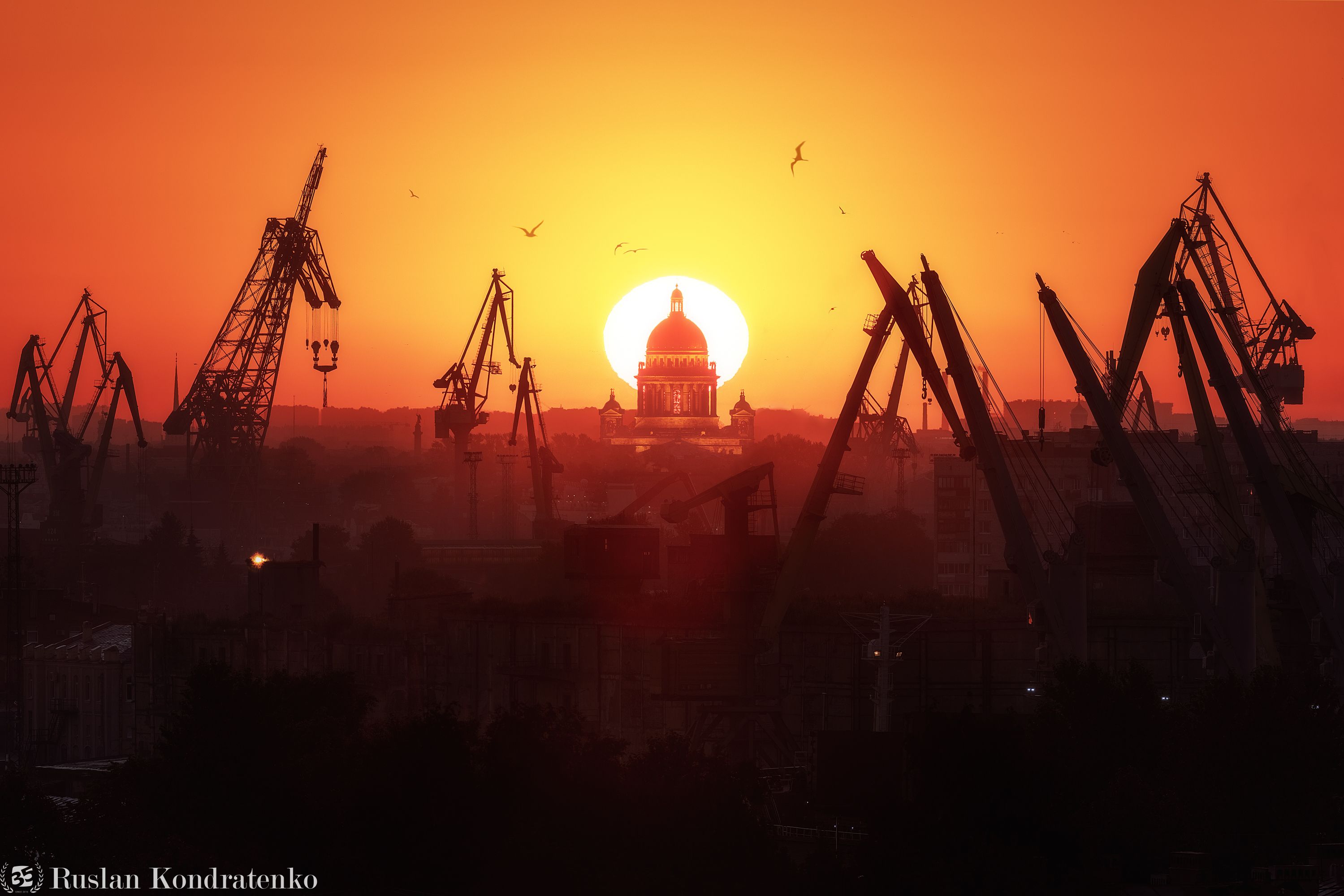 Портовые краны и Исаакиевский собор на фоне восходящего Солнца.