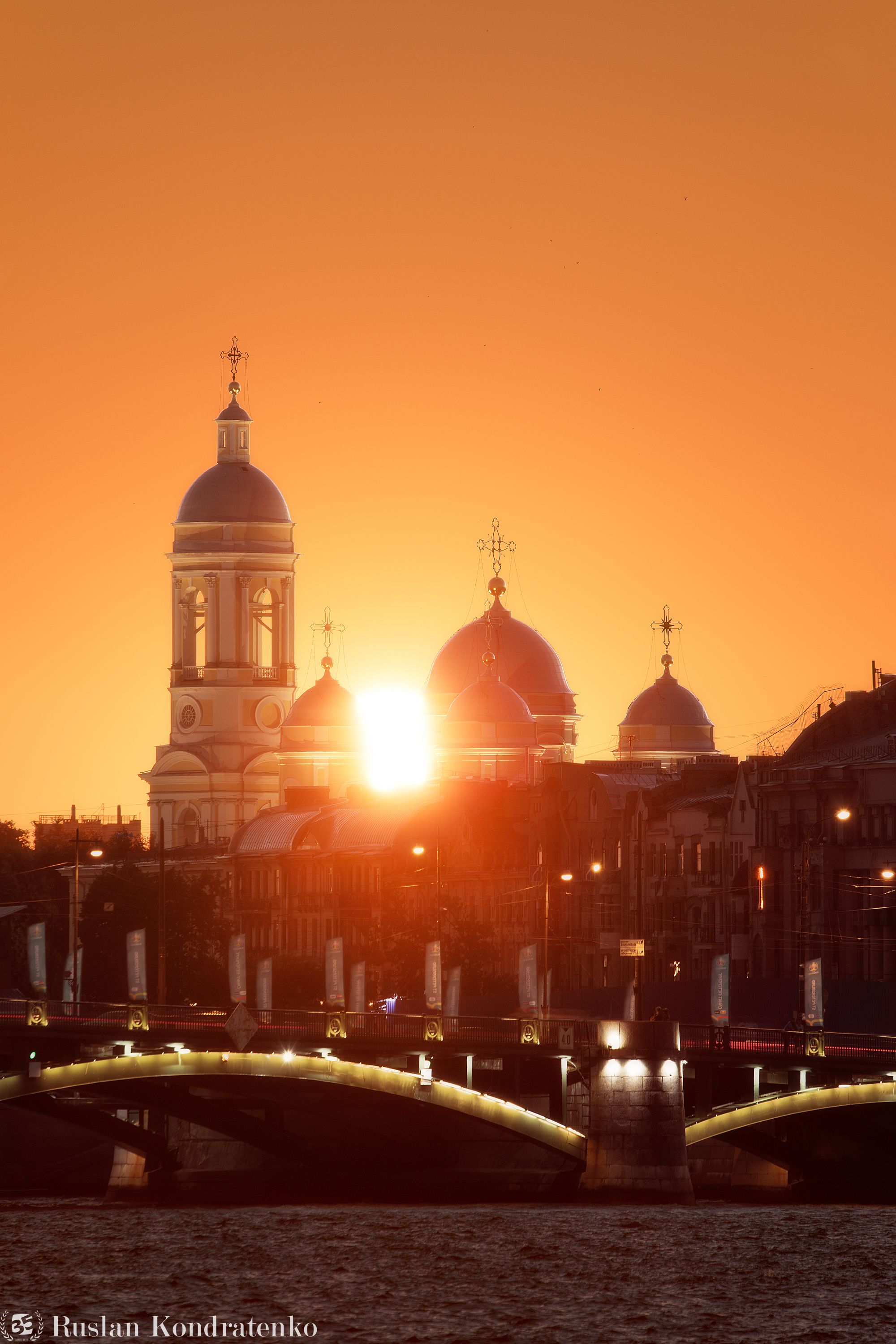 Композитная фотография. Стек из 2х кадров: закат и момент включения архитектурной подсветки.