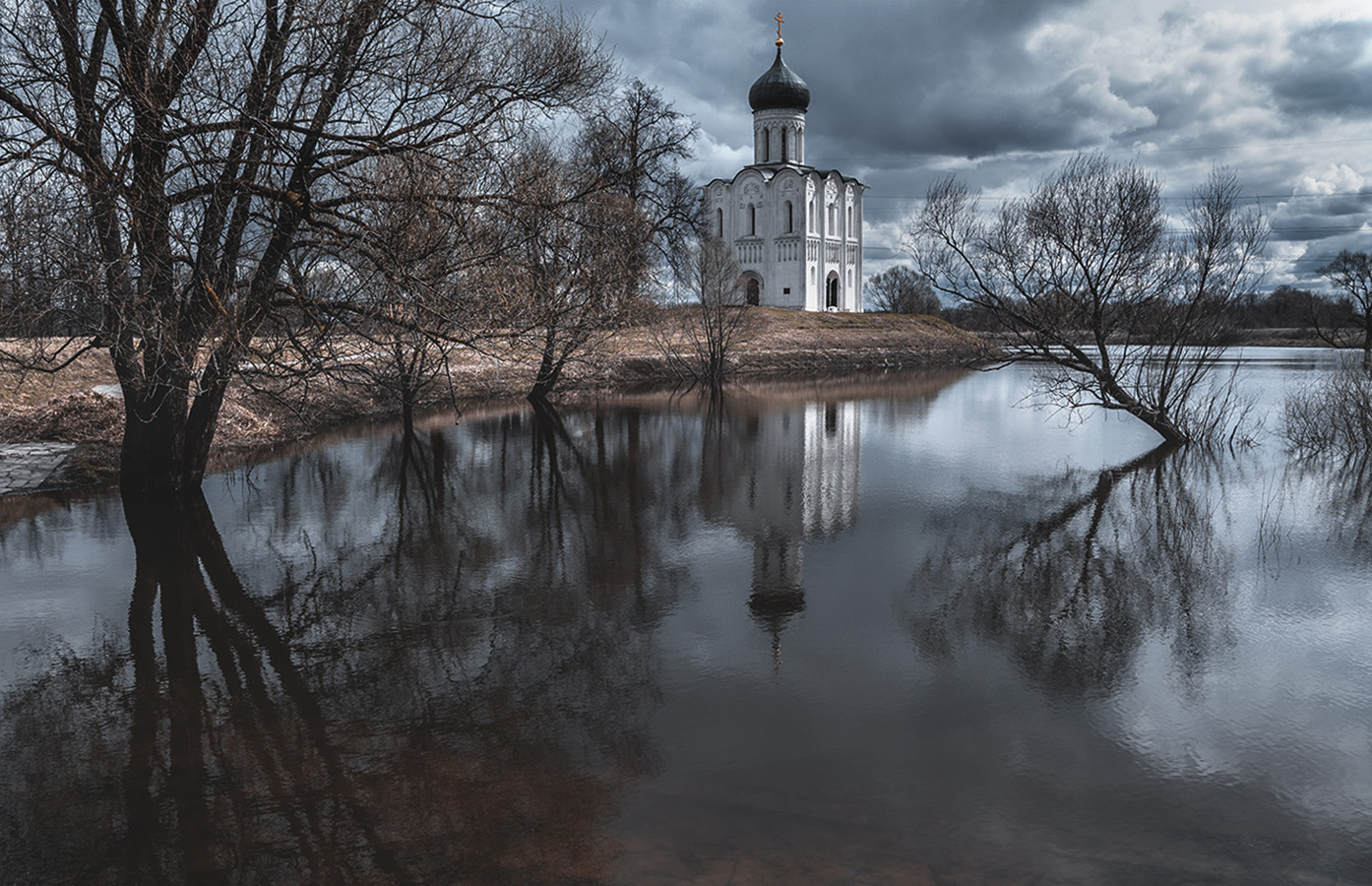Вы передали атмосферу храма на Нерли с убедительной сдержанностью — отражение в воде и голые деревья создают сильный визуальный ритм. Можно немного усилить контраст, чтобы детали архитектуры были чуть четче, но общее впечатление — гармоничное и сдержанно выразительное.