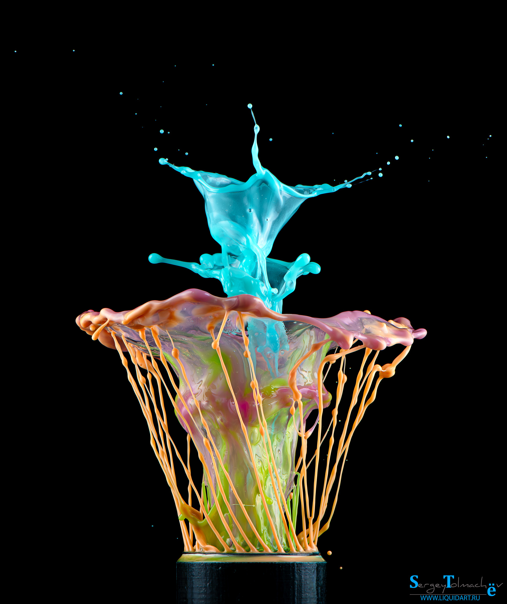 Сергей, как же красиво получилось — всплеск синей жидкости, словно корона, венчает взрыв цвета и формы. Нижняя часть, с её тонкими струнами и переливами, напоминает что-то живое, почти биологическое. Такой снимок создаёт ощущение движения и энергии, будто застыл момент, когда всё в хаосе, но при этом — в совершенном порядке.