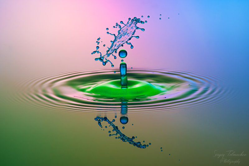 Хоть она и кажется на вид простой, на самом деле очень сложно поймать такой момент. Три капли - первая капля столбик воды, от него отсоединяется капля, с сверху на отсоединившую каплю падает еще одна. На данном снимке от столбика отсоединилось две капли, одна из них посередине.